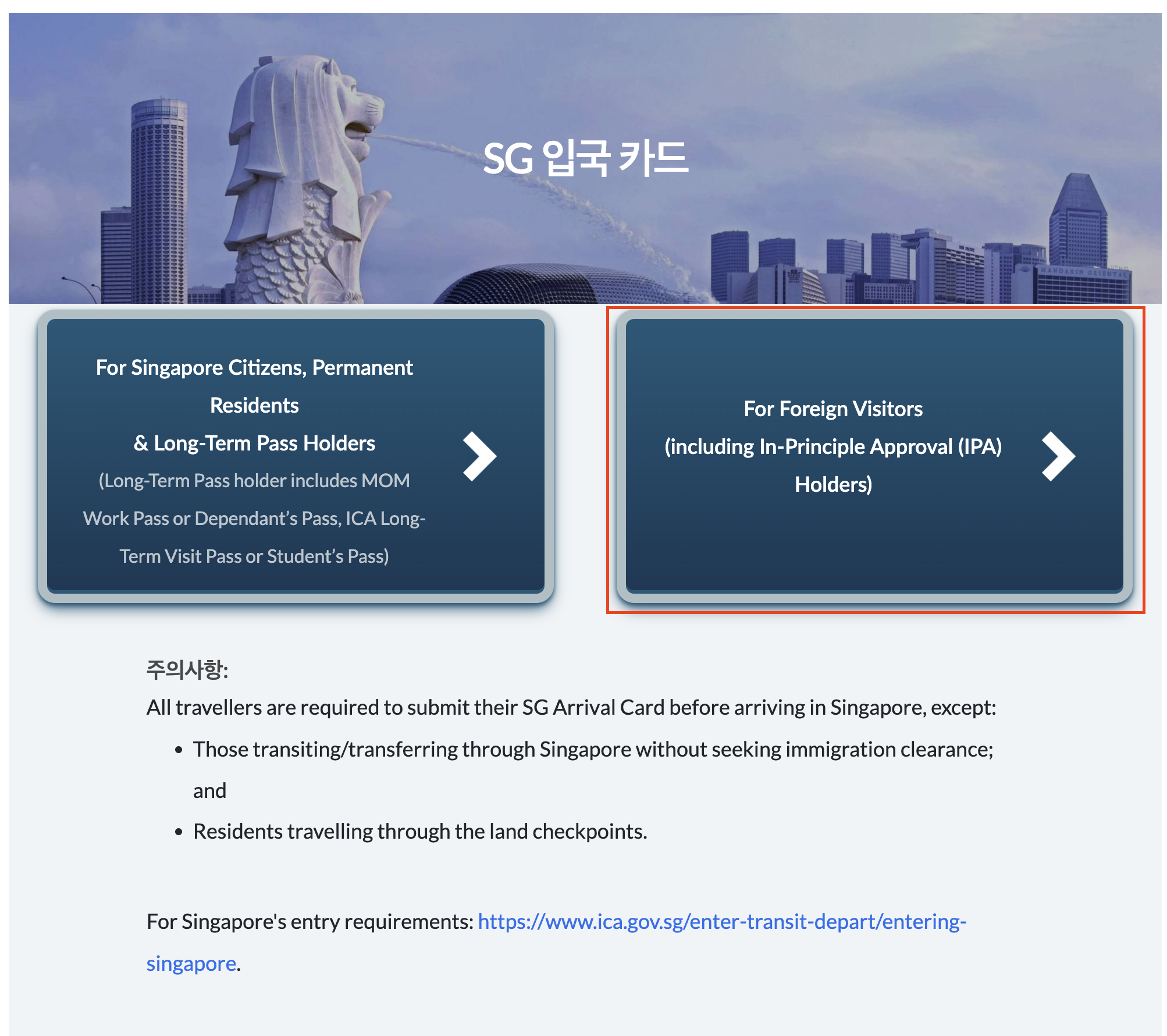 왼쪽 버튼 내용 : 싱가로프 시민권자, 영주권자 및 장기 패스 소지자(MOM 워크 패스, 부양가족 패스, ICA 장기 방문 패스, 학생 패스 등)