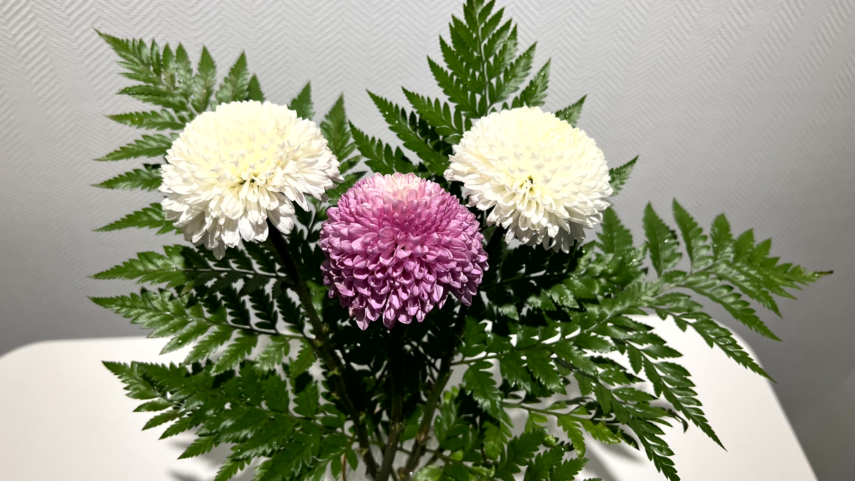 디스버드 퐁퐁 국화는 꽃잎이 겹으로 이루어져 있어 탁구공을 연상케 하기도 하며, 아이가 있는 집에서는 촉감 발달에도 도움이 된다. 고유한 화형이 매력적인 꽃으로 단독으로 꽂아두어도 귀엽다.