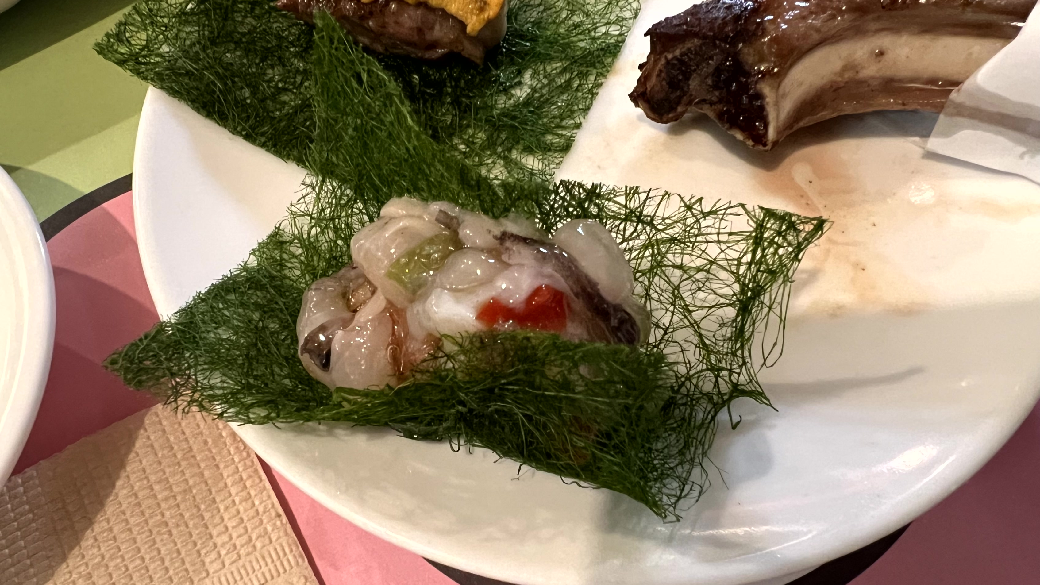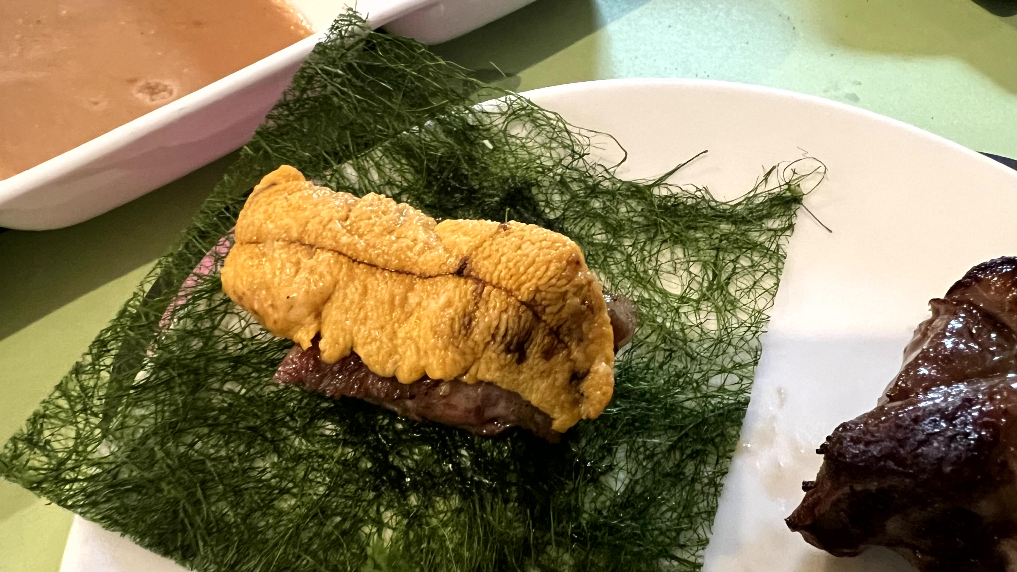 그리고 고기를 다 먹어갈 때쯤 양고기를 감태와 타코와사비, 감태와 우니에 말아서 한 점씩 접시에 놓아 주셨다. 이건 간장 소스에 찍어 먹으면 된다. 그냥 양고기만 먹는 게 더 맛있다는 사람들도 보았는데 개인적으로는 이게 훨씬 더 맛있었다. 하긴, 우니와 타코와사비가 들어갔는데 이 조합이 어떻게 맛이 없을수가 있어...
