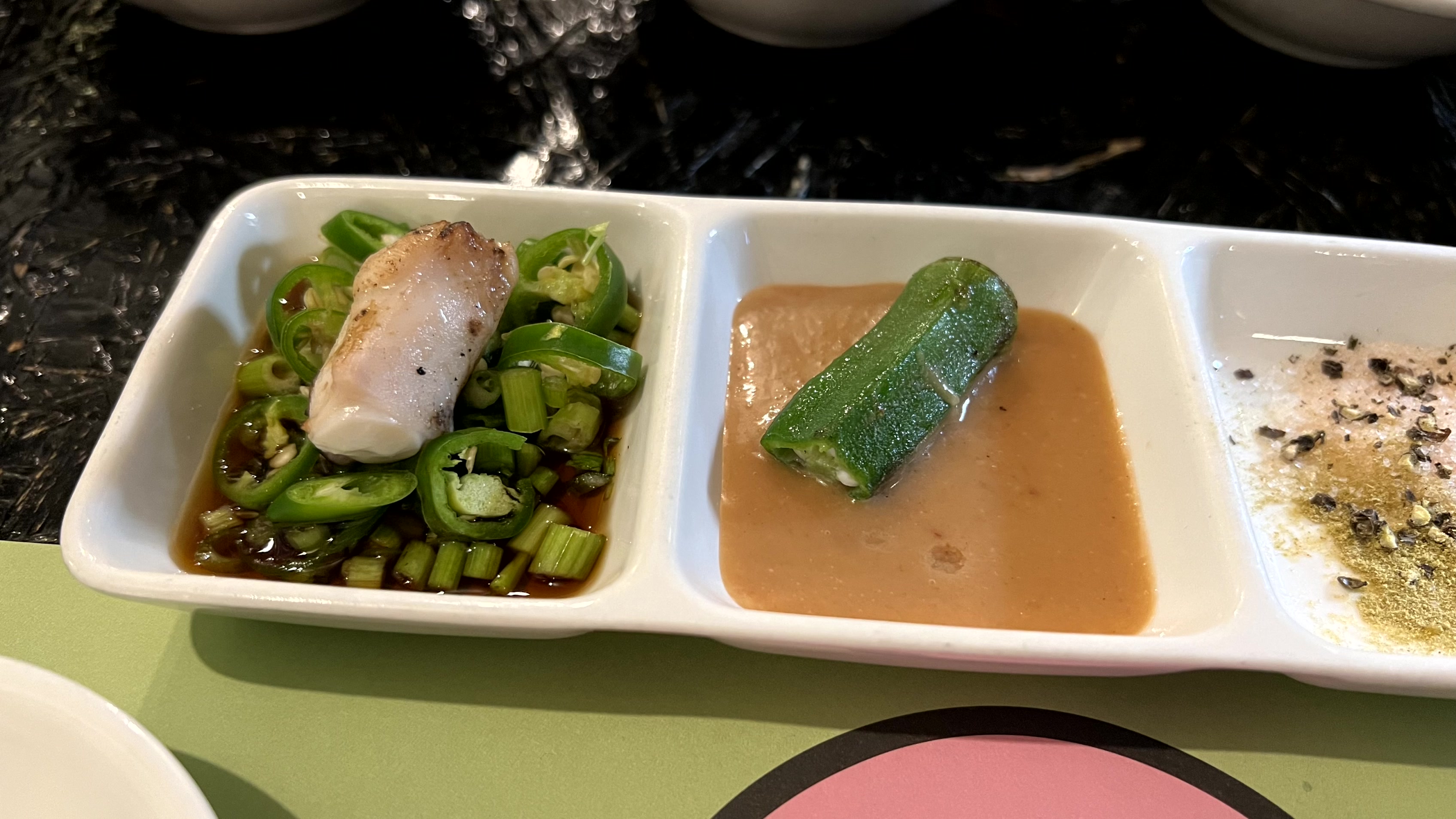먼저 프랜치랙을 구워주셨는데, 첫 고기를 소금에 찍어 먹자마자 "와 뭐야 이거?" 하고 메뉴판을 다시 보았다. 금액을 확인하고 이렇게 맛있는 게 이 금액이라니 가성비에 또 한 번 놀랐다. 심지어 직접 1대1로 구워주시는데... 양갈비 오마카세 최고인 거 같다.