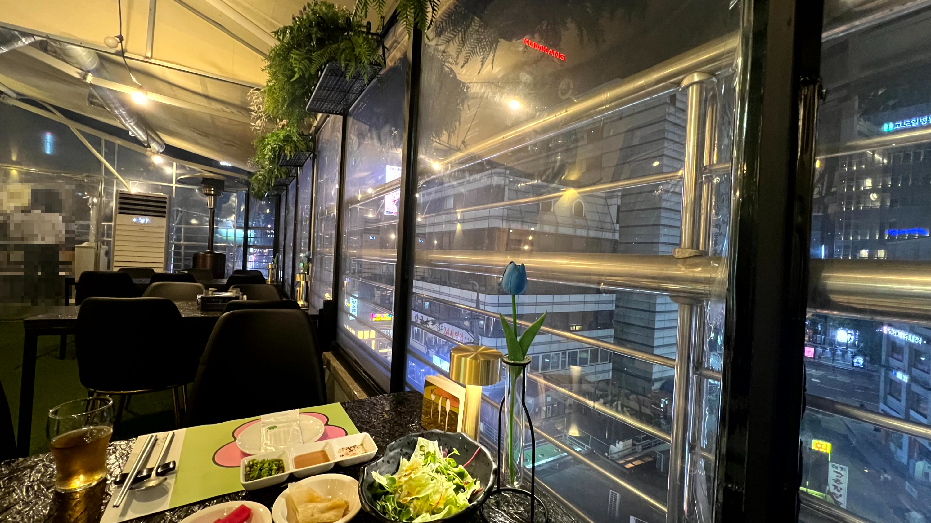 사전예약제를 필수로 한다고 해서 우리는 8시 30분에 예약을 했다. 음식점 이름이 양꽃이라서 그런지 입구에서부터 꽃장식을 한 인테리어가 많이 보였다. 입구 쪽에서 직원에게 테라스 자리를 안내 받았다. 양꽃은 테라스, 룸, 텐트룸을 가지고 있다. 6층에 있어서 테라스에 앉으면 강남 논현동 도심의 한복판이 한 눈에 들어온다. 어제 우리가 방문했을 때에는 OB맥주 신제품이라고 하는 한맥이 이벤트 중이어서 거리가 시끌시끌했다. 축제 분위기의 거리를 바라보며 고기를 먹으니 젊은 에너지(?)를 받는 기분이었다.