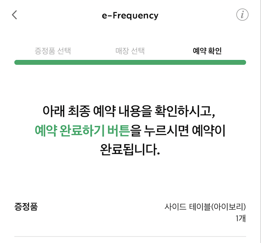증정품을 선택하고, 수령기간 확인 및 매장 선택을 하고, 예약 최종 확인을 하면 끝! 나는 그의 취향인 사이드 테이블 아이보리 색상을 선택했다.