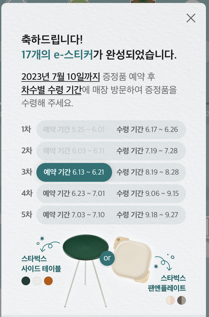 스타벅스 어플에서 이프리퀀시 부분을 누르면 17개의 e-스티커가 완성되었다는 알림 팝업이 뜬다. 훗... 나님 고생했어😎 (열심히 함께 모아준 우리 서방님도 고생했어!!)
