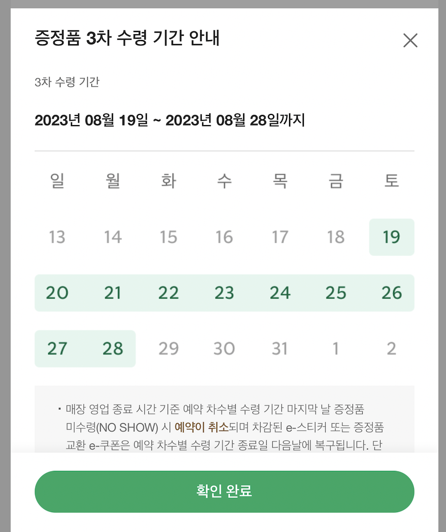 페이지 하단에 있는 증정품 예약하기 버튼을 눌러서, 증정품을 예약할 수 있다. 예전에 래디백 수령할 때는 새벽부터 스타벅스 매장 앞에서 줄서고 난리였는데, 이제는 예약제 시스템을 도입해서 이벤트 참여가 쾌적해졌다. (물론 기다리는 시간은 너무 힘들지만...ㅠㅠ)