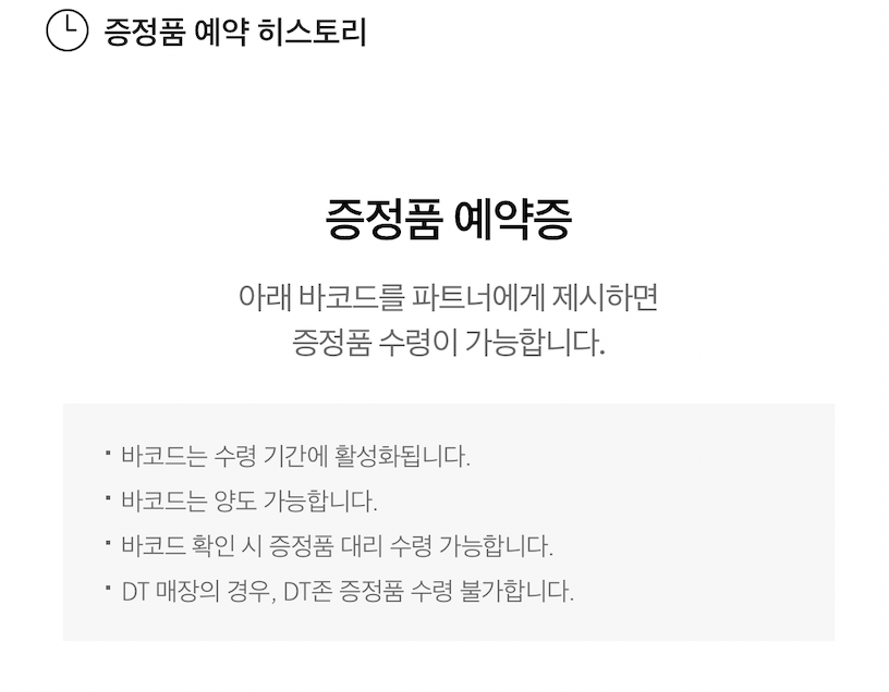 페이지 하단에 있는 증정품 예약하기 버튼을 눌러서, 증정품을 예약할 수 있다. 예전에 래디백 수령할 때는 새벽부터 스타벅스 매장 앞에서 줄서고 난리였는데, 이제는 예약제 시스템을 도입해서 이벤트 참여가 쾌적해졌다. (물론 기다리는 시간은 너무 힘들지만...ㅠㅠ)