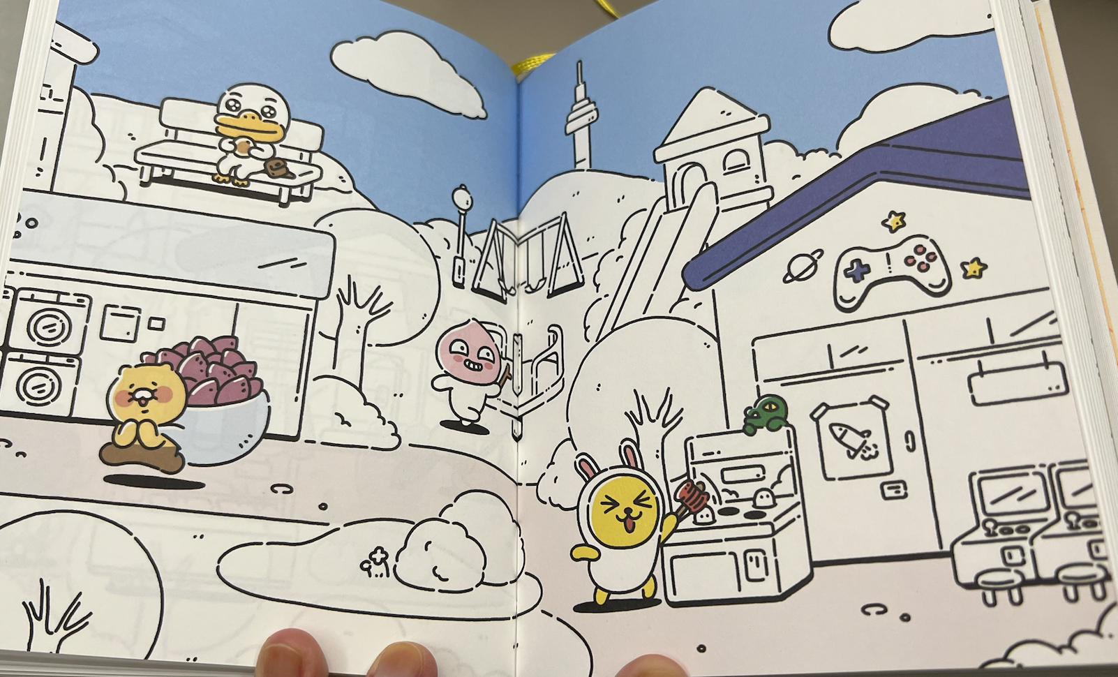 표지를 펼치면 춘식이가 몸을 펴고 누워있는 모습이 된다. 북카페나 서점 같은 곳에서는 3~4권을 나란히 늘어놓아 길게 누워있는 춘식이를 만들 수도 있을 것 같다.