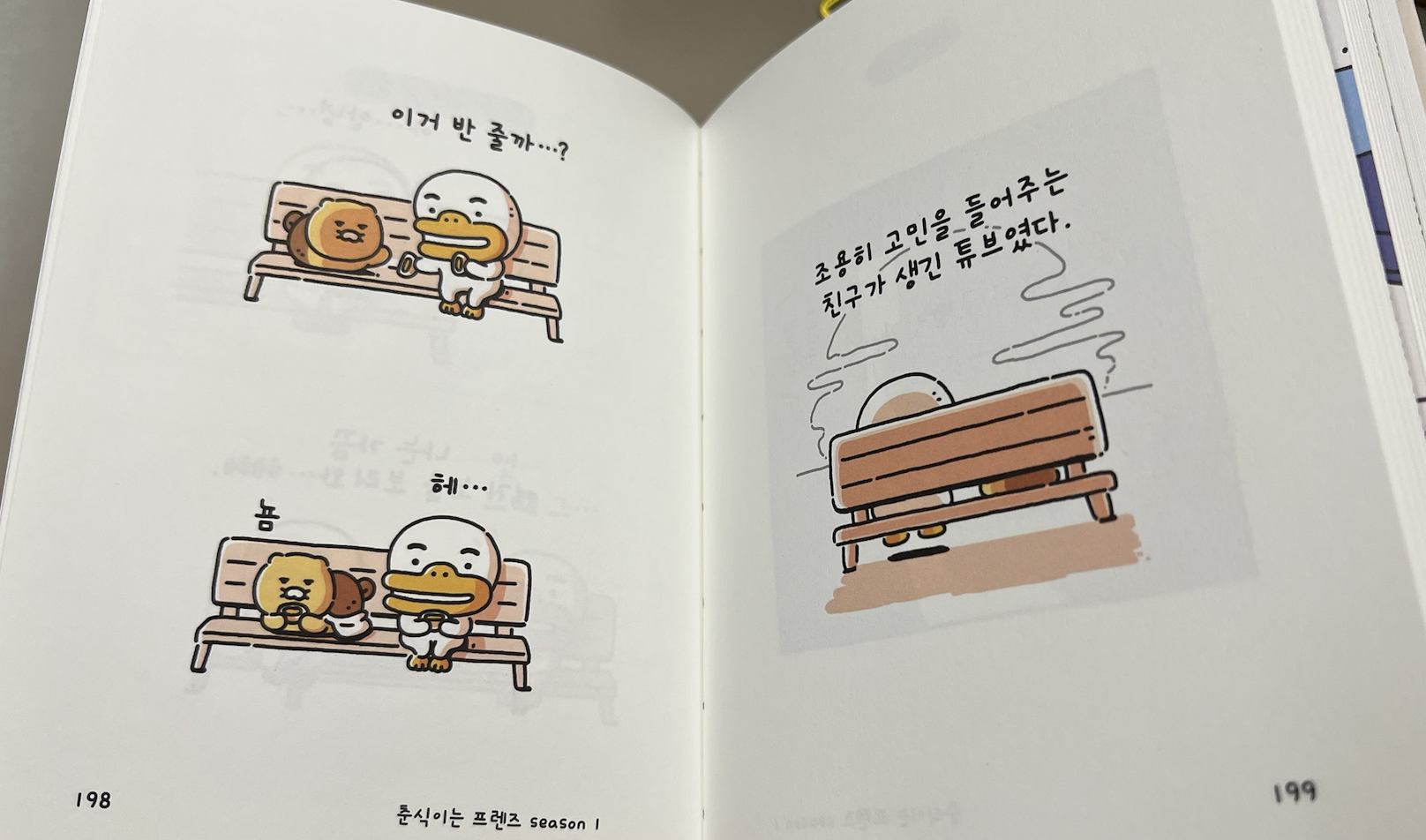 춘식툰은 페이지당 그림, 글씨가 많지 않아서 정말 후다닥 읽을 수 있다. 남은 페이지가 줄어드는 게 아쉬워서 한 장면, 한 장면을 천천히 들여다보면서 읽었다. 그들은 그저 책 속에서 귀여울 뿐인데, 나는 그런 라이언과 춘식이를 보며 마음을 위로받는다. 정말 행복한 독서시간이었다.