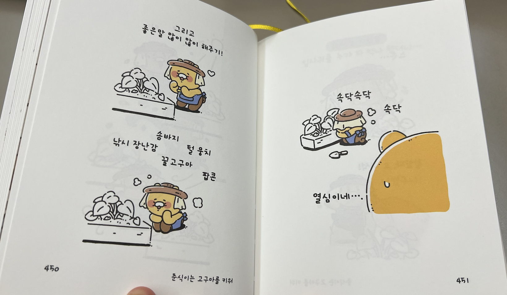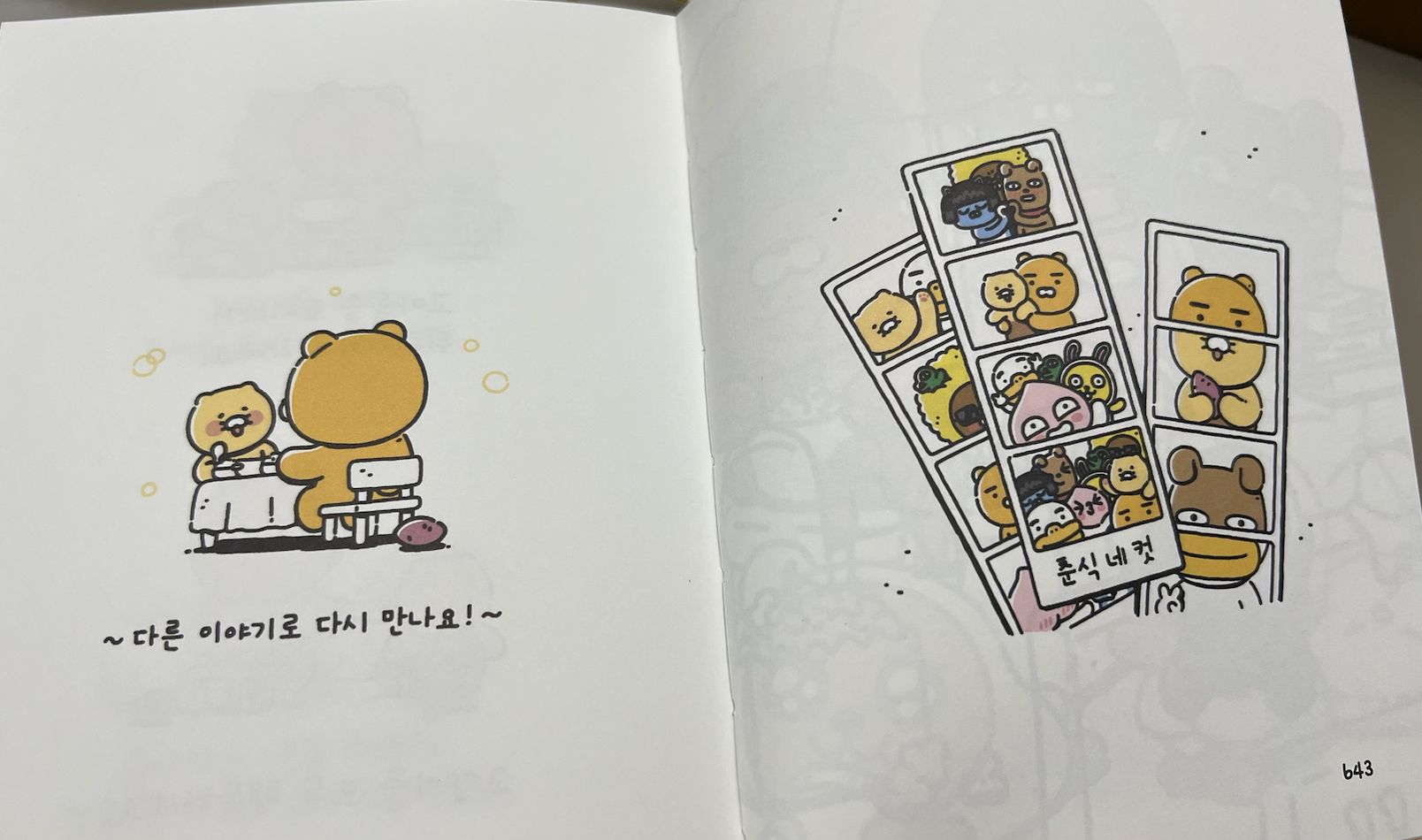 표지를 펼치면 춘식이가 몸을 펴고 누워있는 모습이 된다. 북카페나 서점 같은 곳에서는 3~4권을 나란히 늘어놓아 길게 누워있는 춘식이를 만들 수도 있을 것 같다.