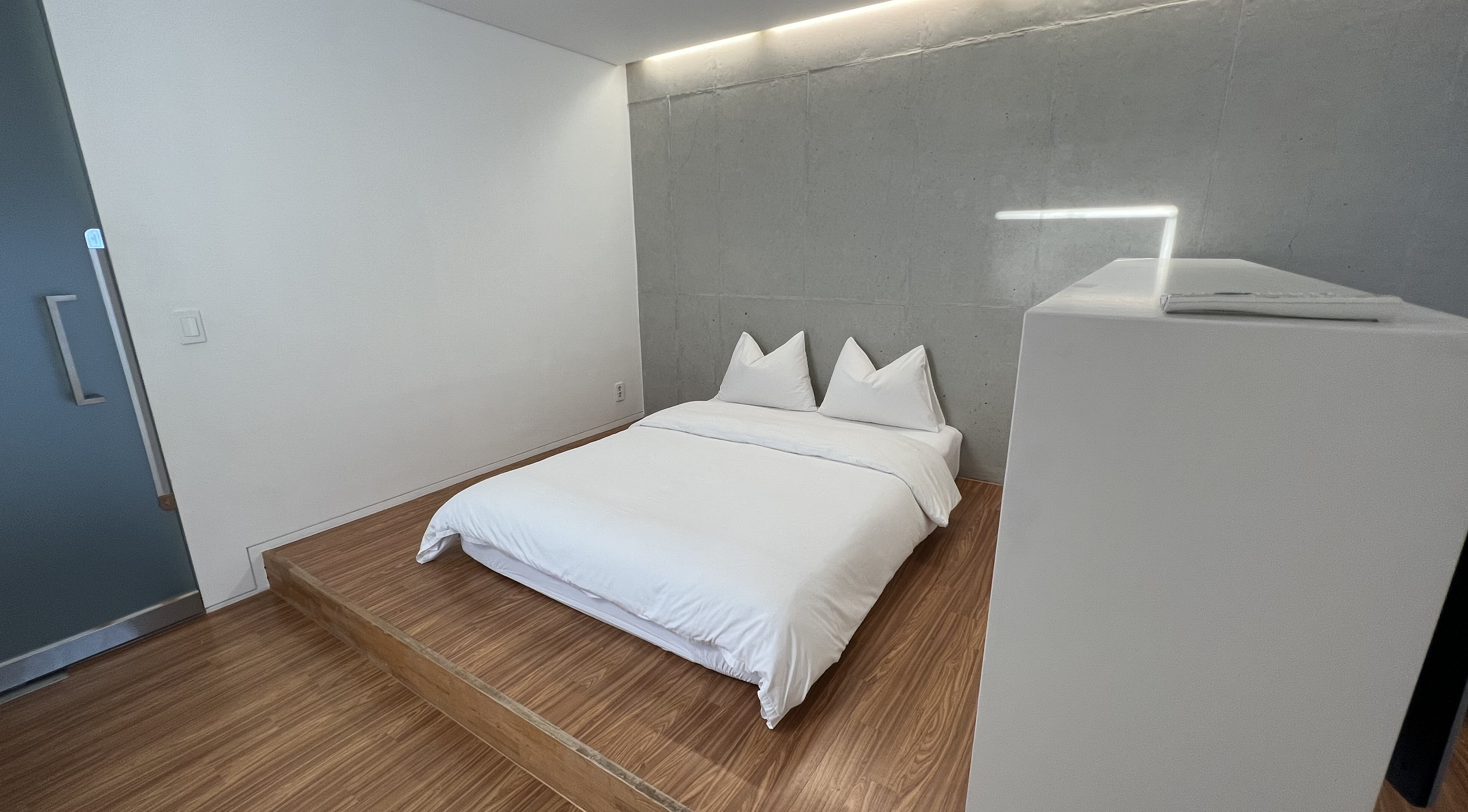 벽 뒤에는 침대가 있다. 호시담은 세계 2대 브랜드 중 하나인 탈라레이 라텍스 매트리스와 헝가리산 거위 가슴 솜털(90%)만을 사용하여 아주 가볍고 따뜻한 구스다운을 사용하고 있다고 한다. 누워보니 정말 호텔 침구 부럽지 않은 퀄리티의 침대였다.