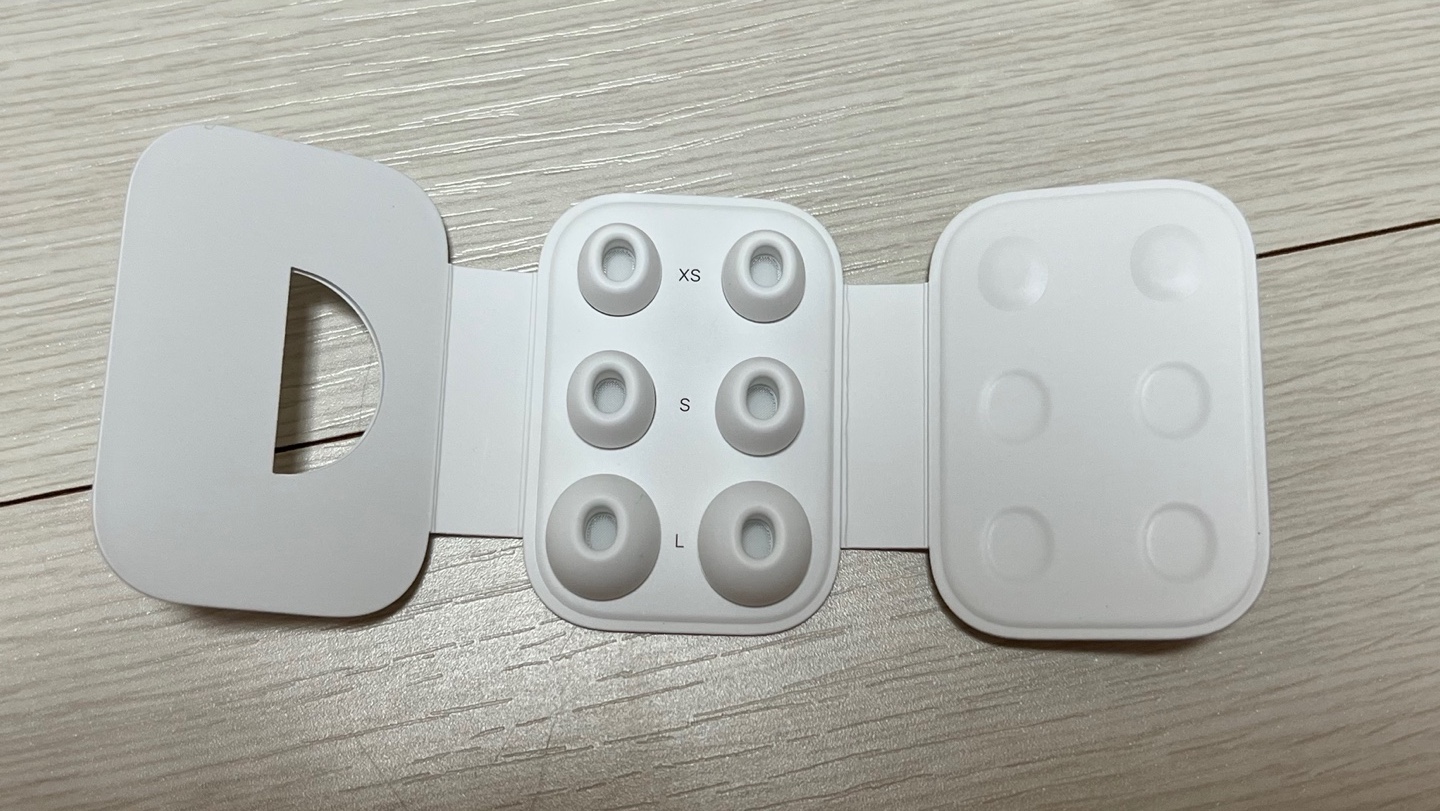 그리고 에어팟 본체 아래에는 충전케이블과 다양한 사이즈의 이어팁이 들어있다. 에어팟 프로 2세대는 애플 전용 케이블을 사용하는데, USB-C타입이 아닌 것도 조금 아쉬웠다. (하지만 이 부분은 아이폰도 마찬가지이니까 뭐...)