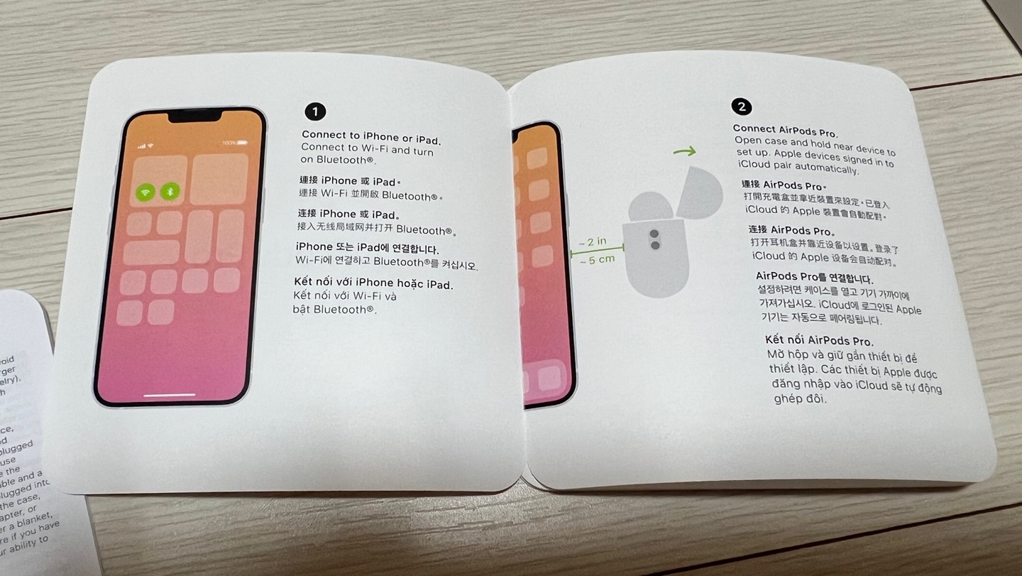 에어팟 프로 박스를 열면 여러 나라 언어로 이루어진 가이드북이 들어있다.