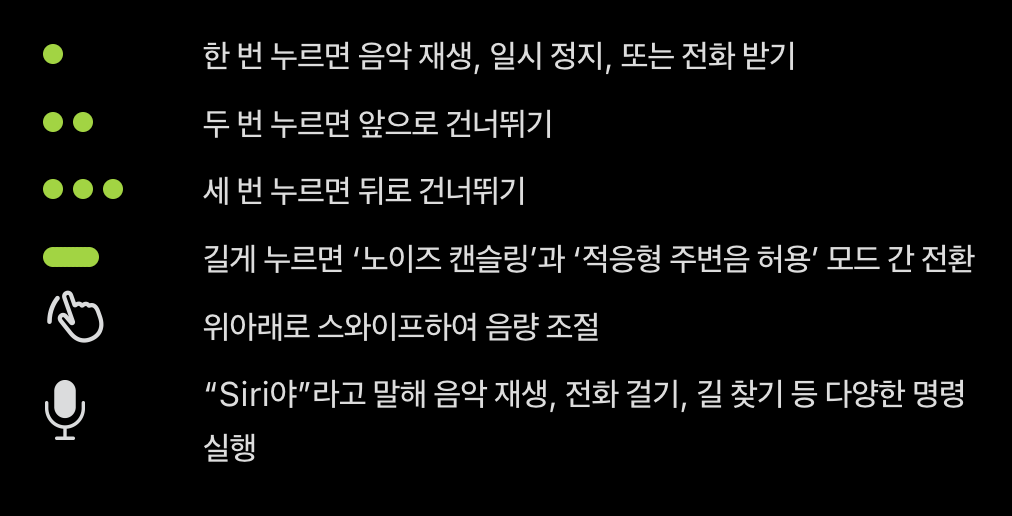 그 외에도 전화를 받거나 끊을 수도 있고, 길게 누르면 액티브 노이즈 캔슬링과 적응형 주변음 허용 모드 사이를 전환할 수 있다.