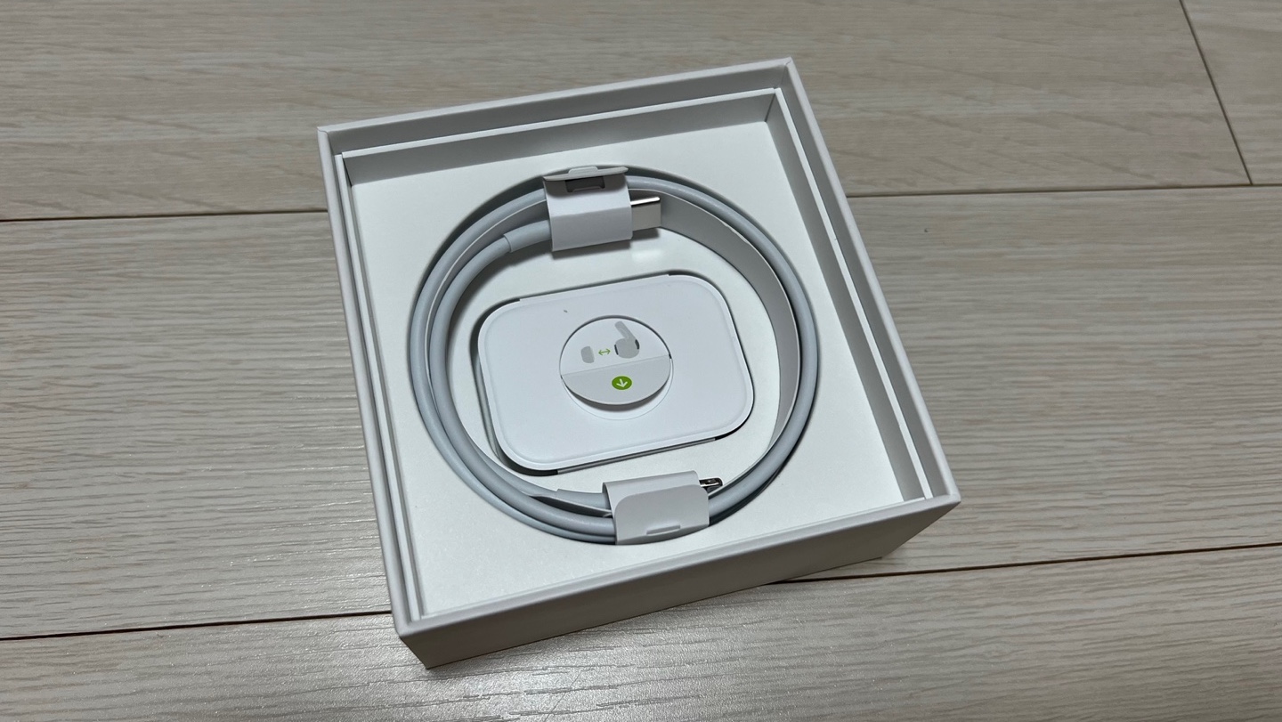 그리고 에어팟 본체 아래에는 충전케이블과 다양한 사이즈의 이어팁이 들어있다. 에어팟 프로 2세대는 애플 전용 케이블을 사용하는데, USB-C타입이 아닌 것도 조금 아쉬웠다. (하지만 이 부분은 아이폰도 마찬가지이니까 뭐...)