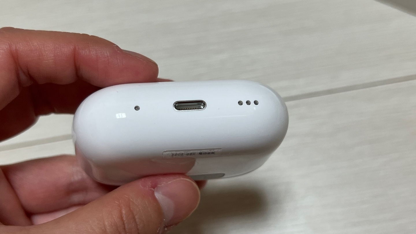 하단에서는 충전 케이블을 꽂아서 충전을 할 수 있다. 충전하는 부분 우측의 3개 점은 내장형 스피커이다. 케이스를 잃어버렸을 때 쉽게 찾을 수 있도록 사운드를 재생해주고 배터리가 얼마 남았음을 알리거나 페어링 완료를 알려주는 알림음이 나온다.