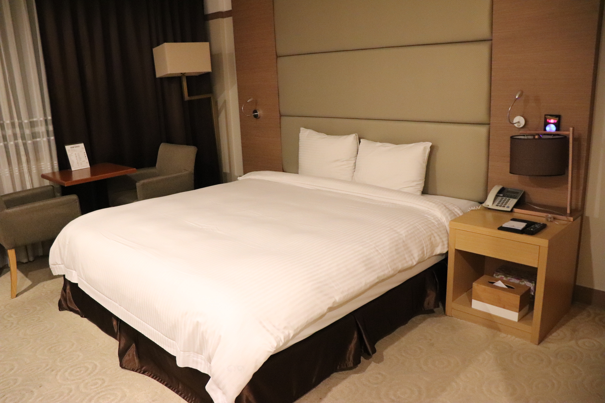 푹신한 침대 양 옆으로 테이블과 의자, 협탁이 놓여 있다.