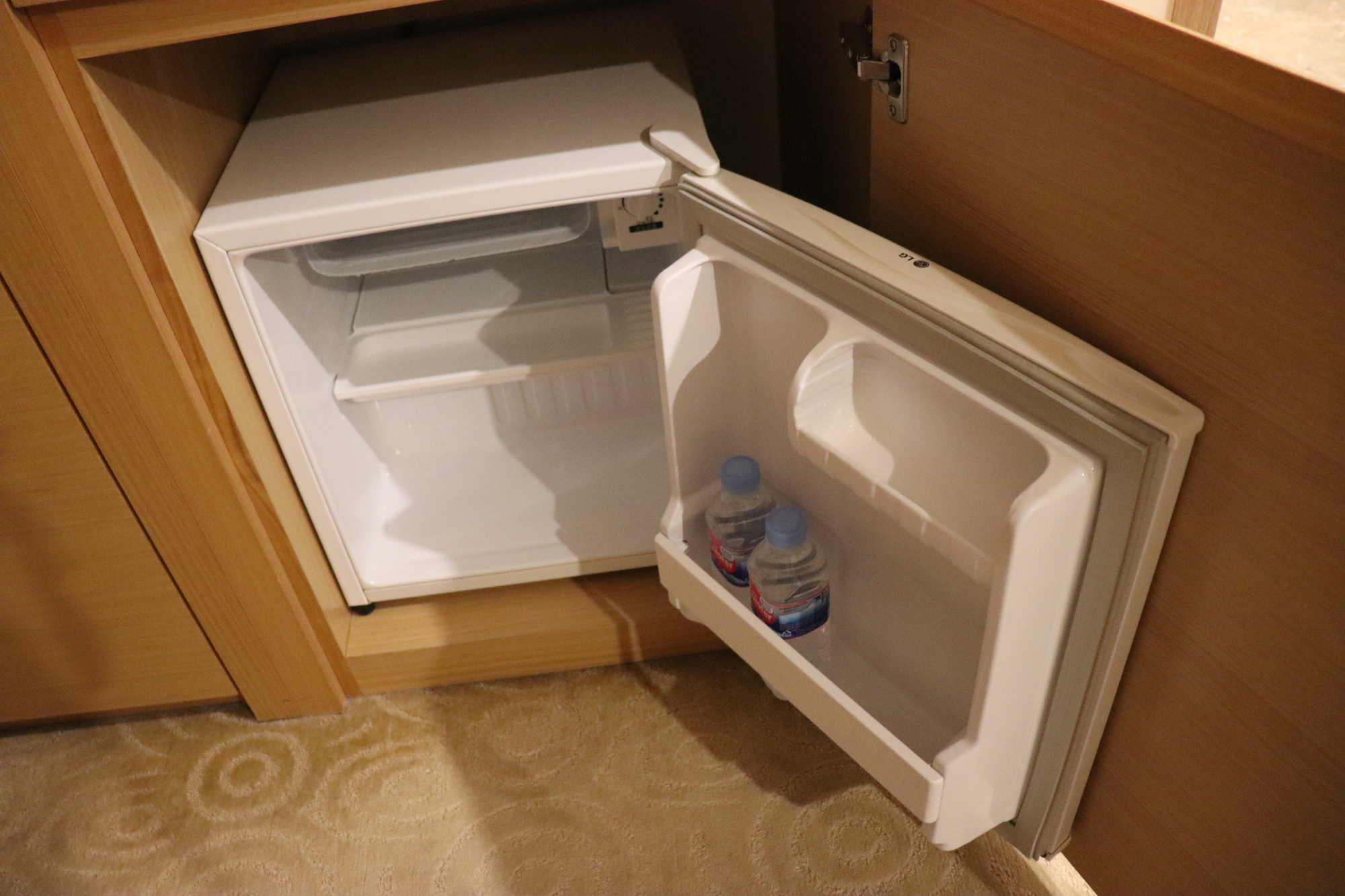 간단하게 차를 마실 수 있는 선반이 있고, 그 아래에는 냉장고가 있는데 생수가 2병 들어있다.