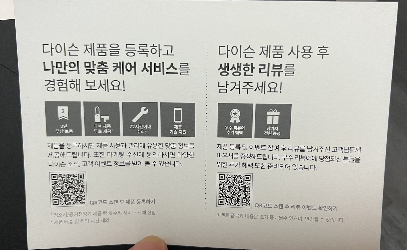 웰컴카드는 별거 없고 다이슨 제품을 등록하고 맞춤 케어 서비스를 받으라는 내용과 제품을 사용한 후에 리뷰를 남겨 달라는 내용이었다. (이게 어째서 웰컴이야...🤔)