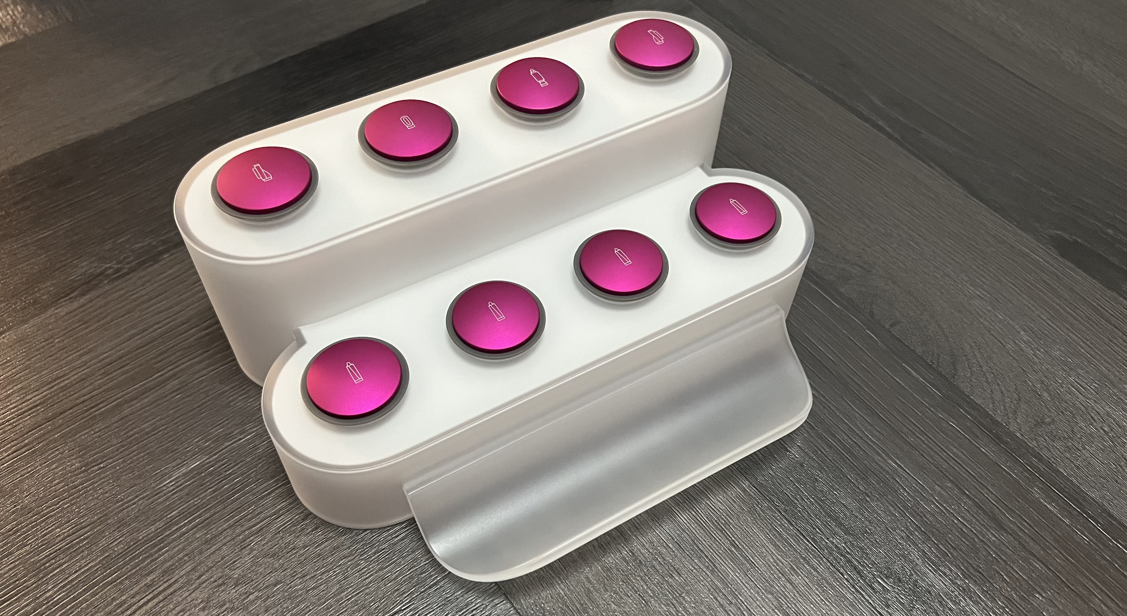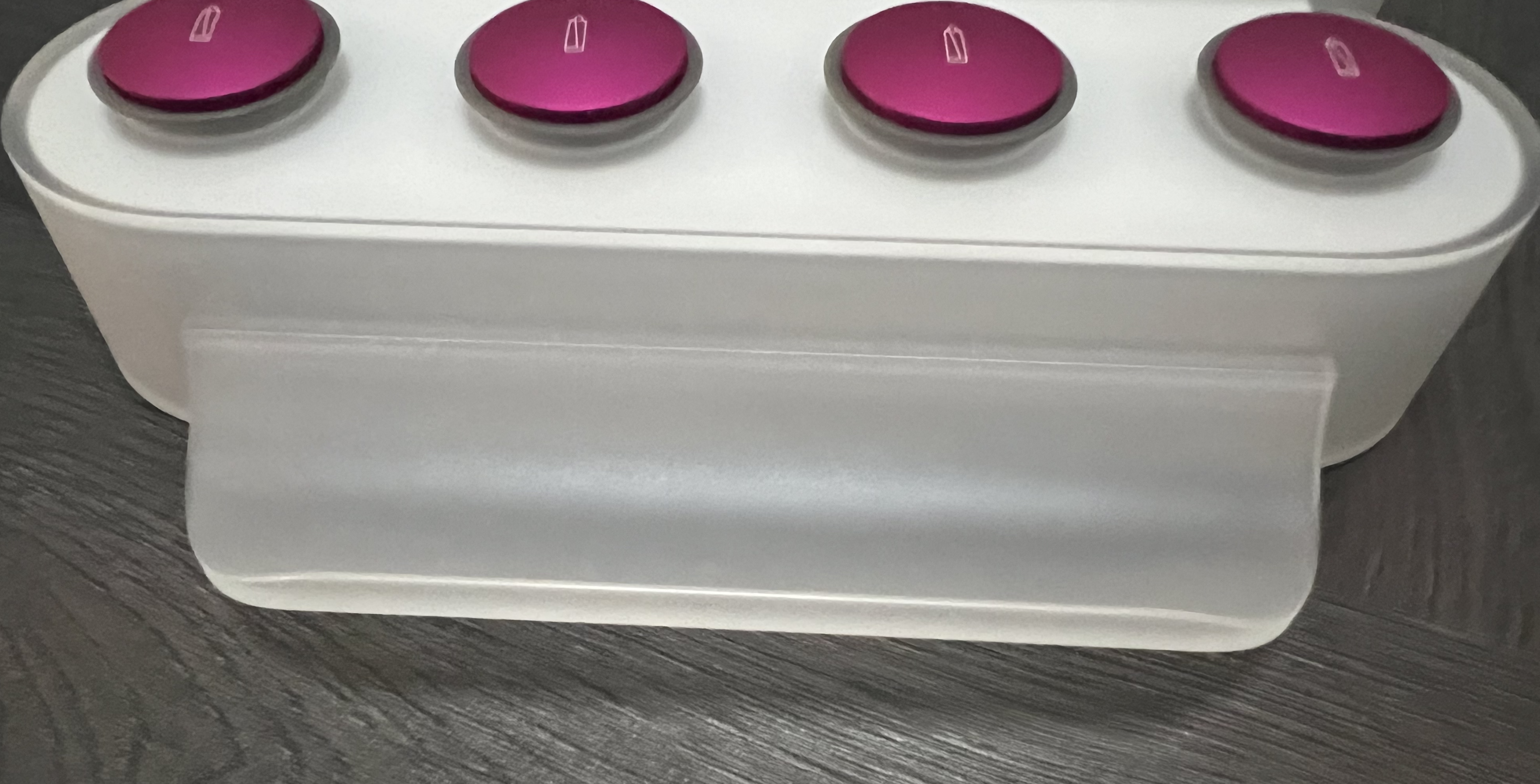 바닥은 미끄러지지 않도록 처리되어 있고, 앞쪽에는 스타일러를 올려둘 수 있는 공간이 있다. 원하는 배럴을 손쉽게 찾아서 쓸 수 있도록 2단으로 구성되어 있다.