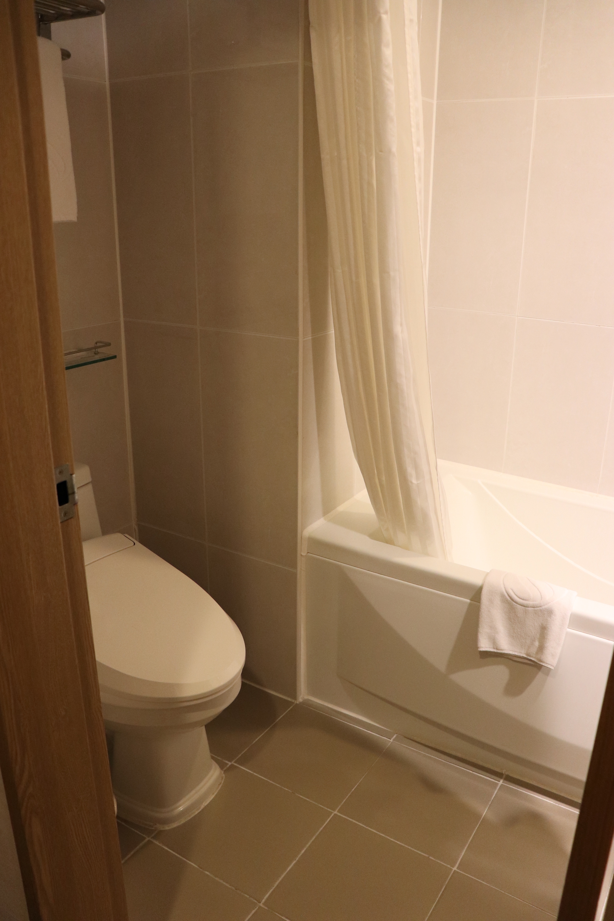 화장실에는 샤워실 대신 욕조가 있다. 화장실도 전체적으로 깨끗하고 수건도 충분히 준비되어 있어 금액대비 나쁘지 않았다는 생각이 든다. 뜨거운 물도 아주 잘 나왔다.