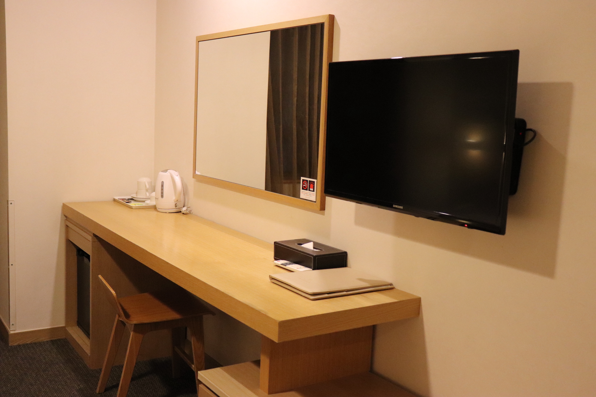 침대 맞은편에는 거울, 벽걸이 티비, 커피포트 등이 놓여 있다.