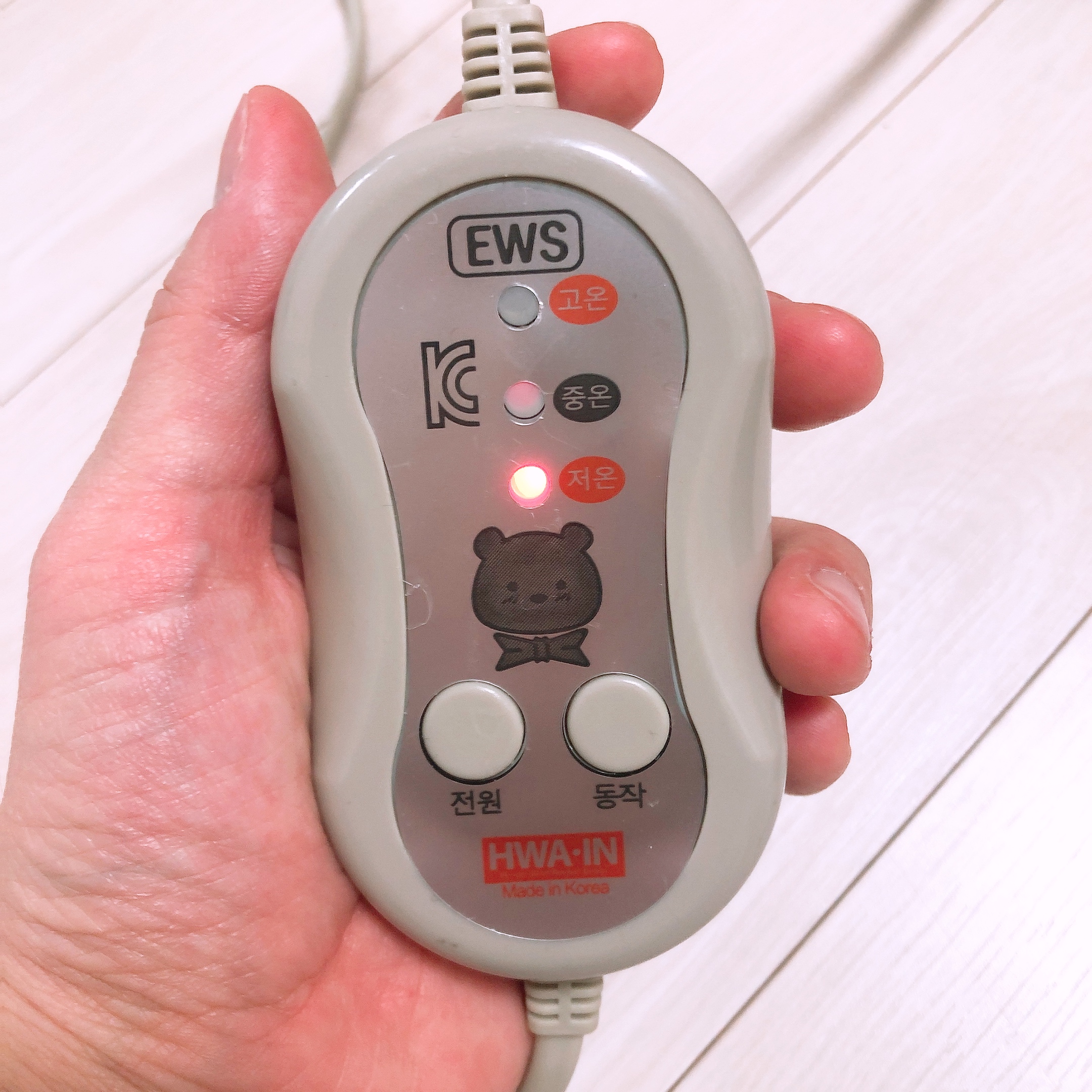 전원 버튼을 누르면 '저온'에 불이 들어온다. 그 다음 동작 버튼을 눌러서 3단 온도 조절이 가능하다. 사용해 본 결과 저온으로만 해 두어도 따뜻함을 느끼기에 충분했다. 8시간 타이머 기능이 내장되어 있으며, 전자파 차폐원단 작용도 한다고 하니 안심이다.