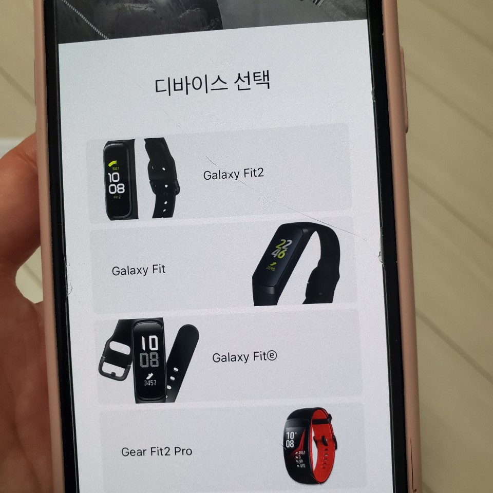 Samsung Galaxy Fit 이라는 앱을 다운로드한다. 추가로 Samsung Health 앱도 다운로드하자! 앱을 실행하고 가지고 있는 디바이스 선택을 하면 자동으로 블루투스를 통해 해당 기기를 찾아준다.