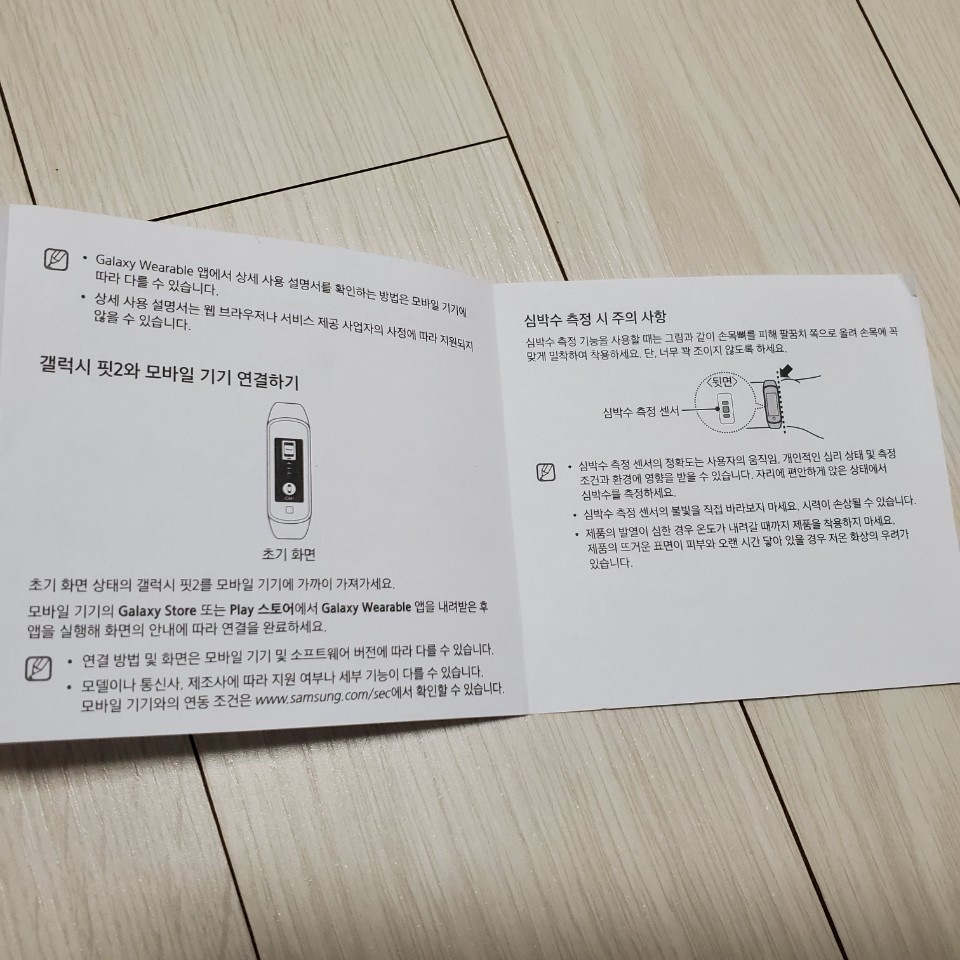 배터리 충전하는 방법부터 모바일 기기 연결하기, 심박수 측정하기, 착용하는 방법과 주의사항까지 처음 사용하는 데에 불편함이 없도록 꼼꼼하고 친절하게 설명이 되어 있다.