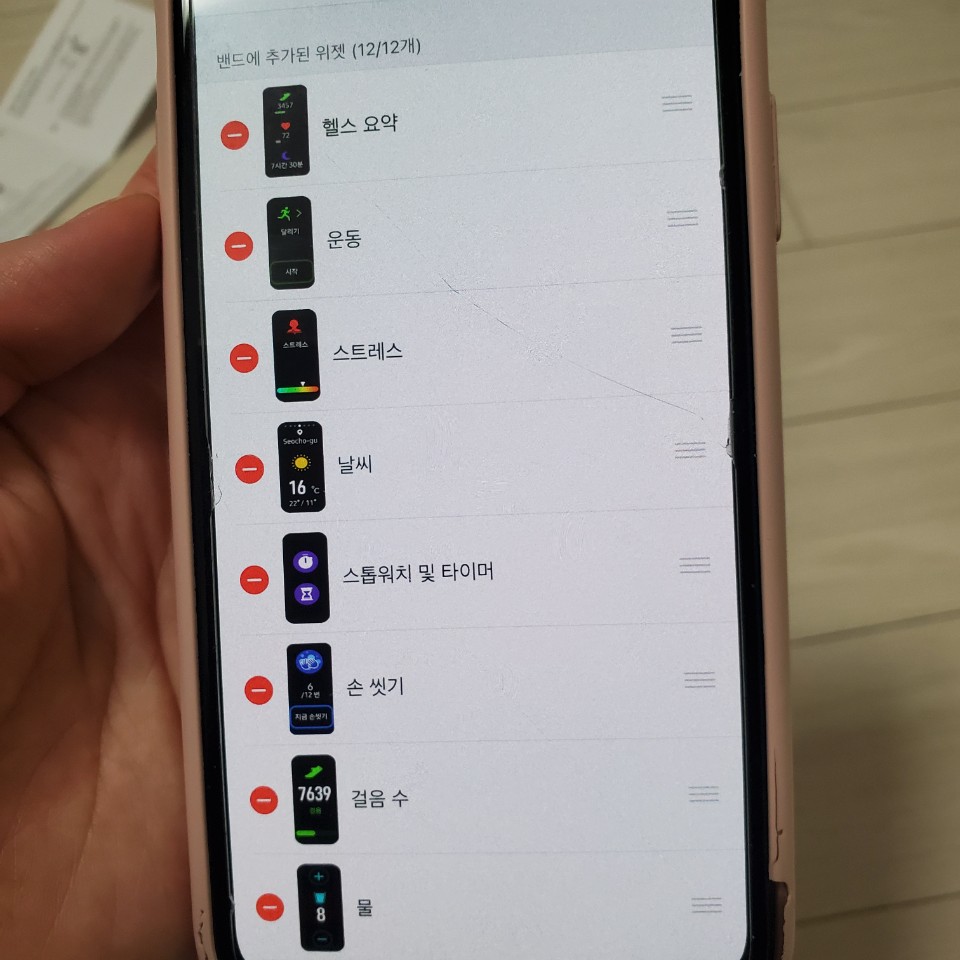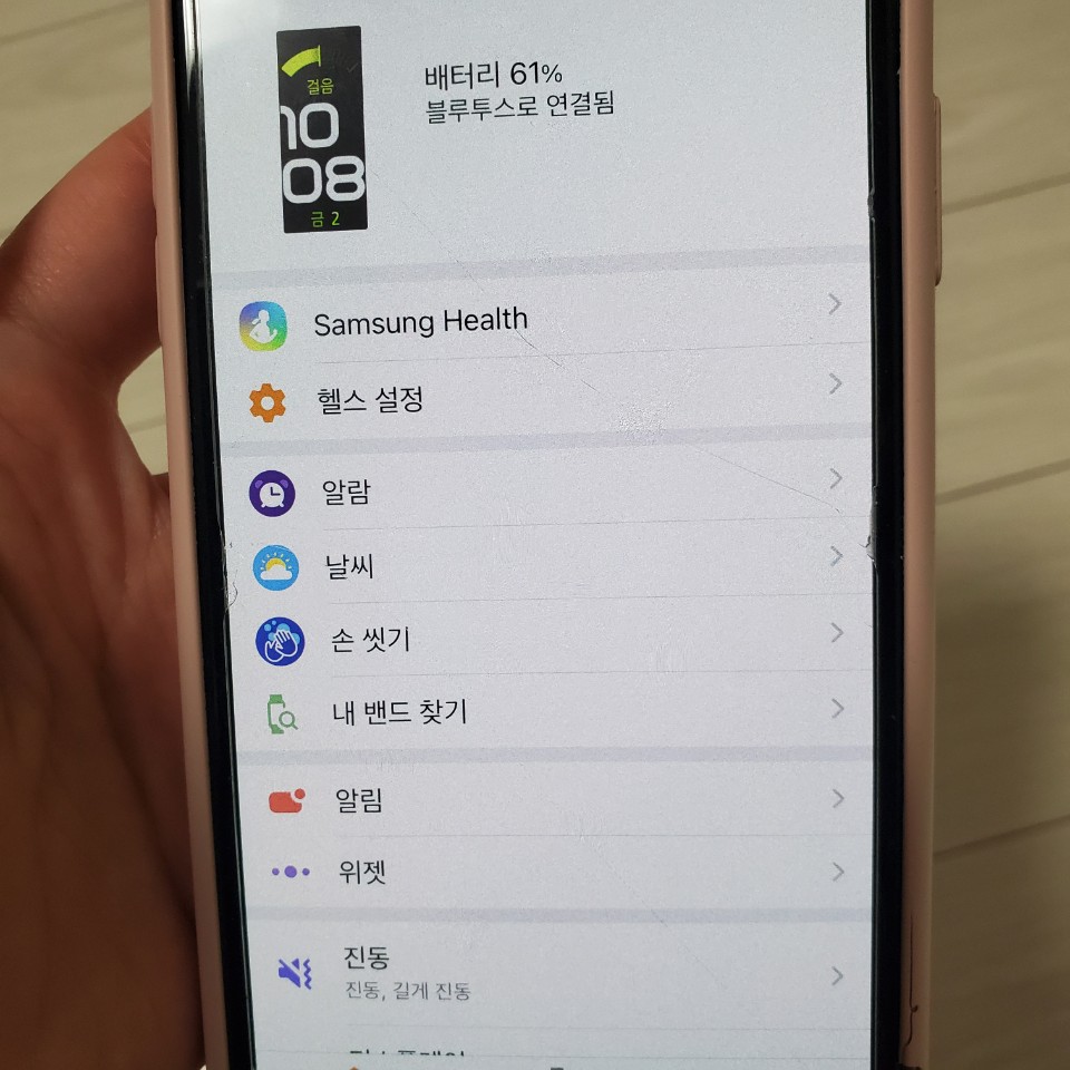빠르고 간편하게 갤럭시 핏2 연동 성공! 알람, 날씨, 손 씻기, 알림, 진동 등 기본 사항들을 세팅할 수 있다. 그리고 갤럭시 핏2 스마트밴드 액정에 보여질 위젯들도 직접 선택할 수 있다.