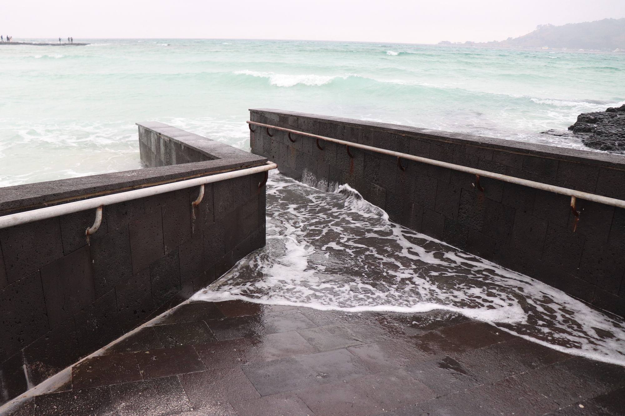 비는 그쳤지만 바람이 많이 불어서 파도가 거친 편이었다. 우리는 바다를 더 가까이 보고 싶어서 돌 위로 올라가 바다 배경으로 사진도 찍고, 돌에 부딪혀 하얗게 부서지는 파도도 한참을 바라보았다. (출입금지구역 아님)