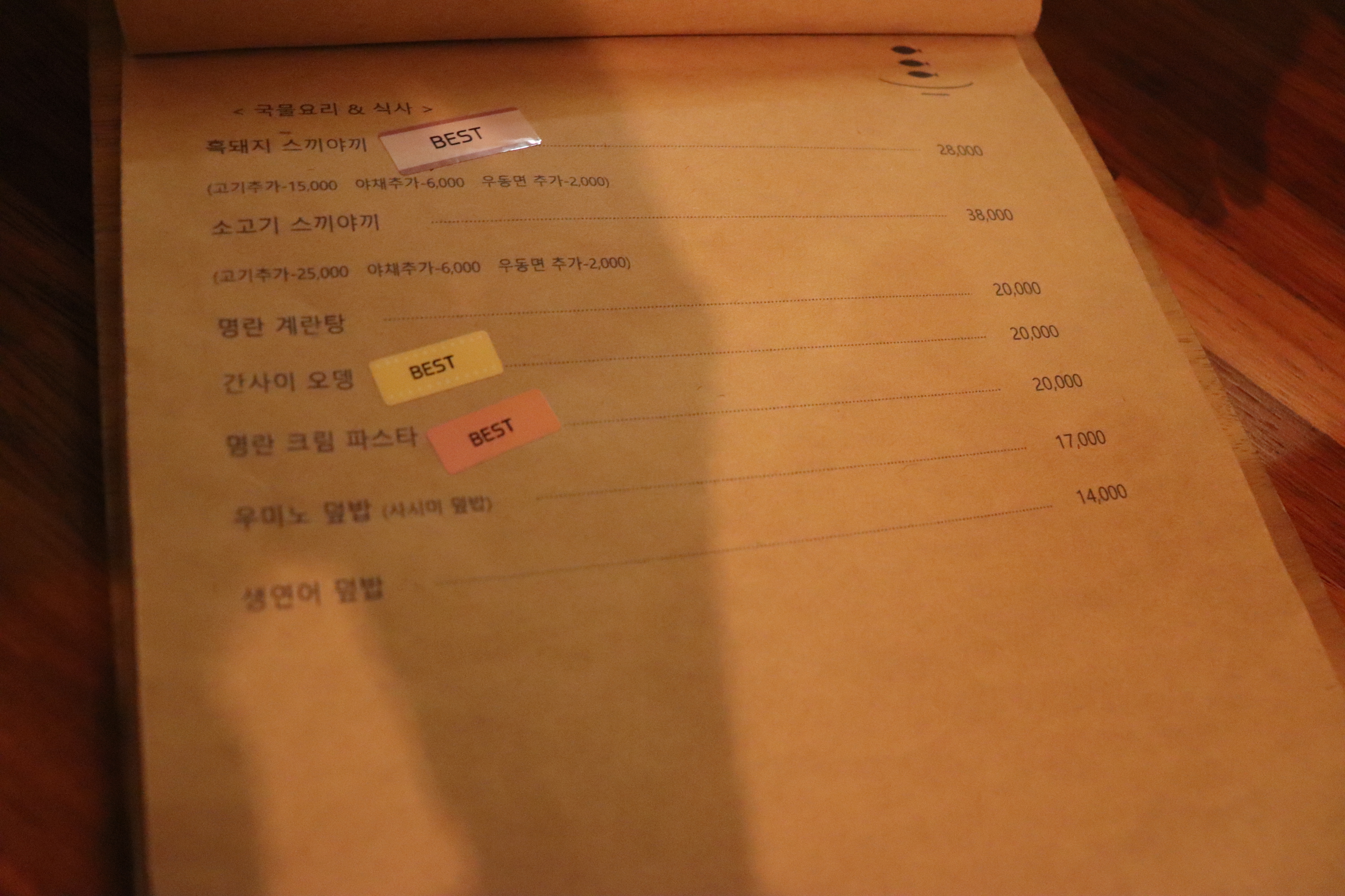 내부가 엄청 넓진 않았지만 바 테이블과 일반 테이블이 골고루 배치된 평범한 이자카야 인테리어였다. 전체적으로 따뜻한 조명이라 안락한 기분이 들었고, 구석에 진열된 와인이 눈에 확 들어왔다.