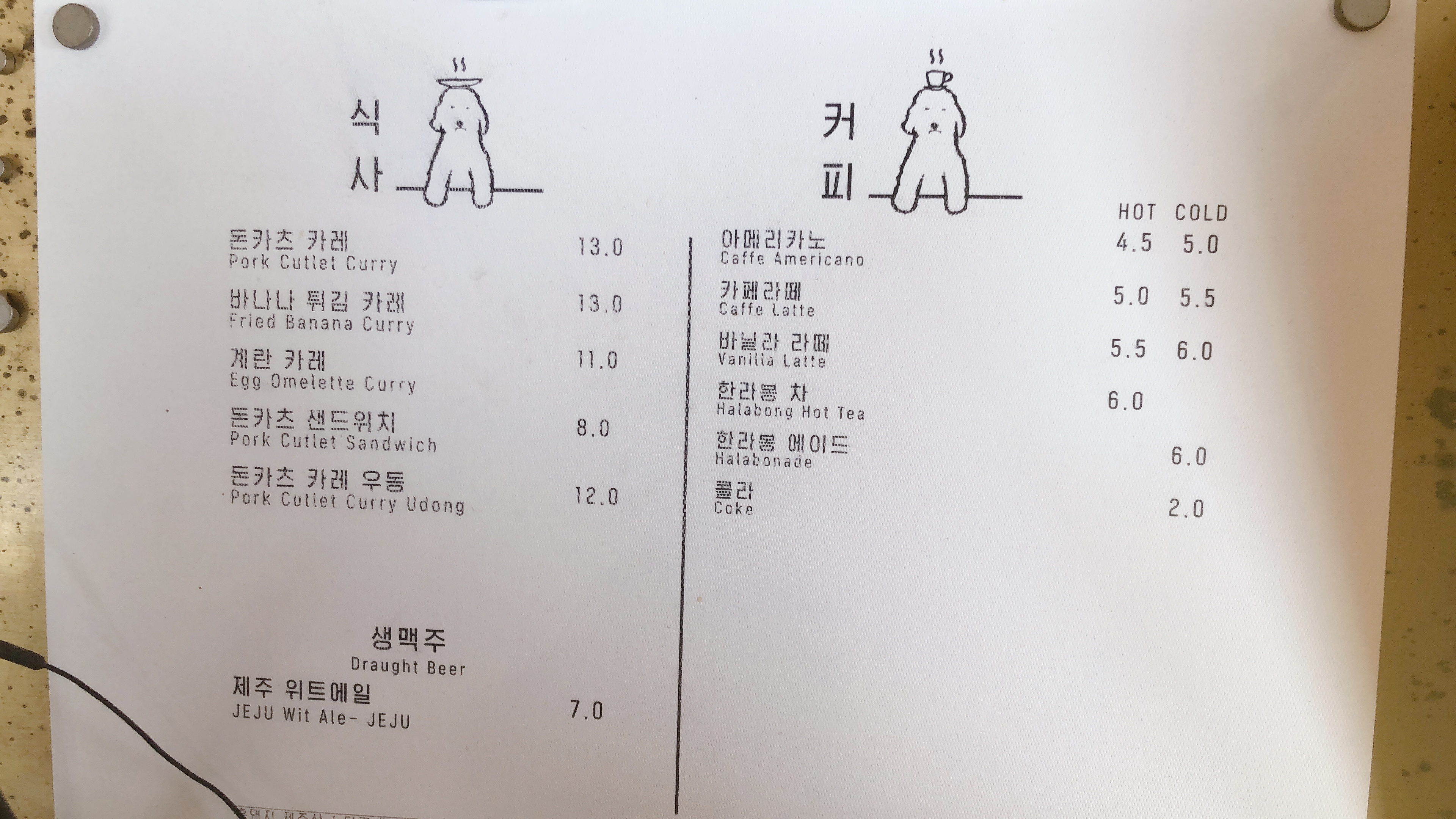 심바카레의 메뉴 구성은 심플한 편이었다. 카레종류 3가지와 샌드위치, 우동 - 총 5가지의 메뉴가 제공되고 있었다. 커피도 아메리카노, 카페라떼, 바닐라 라떼, 한라봉 음료, 콜라 중 선택이었다.