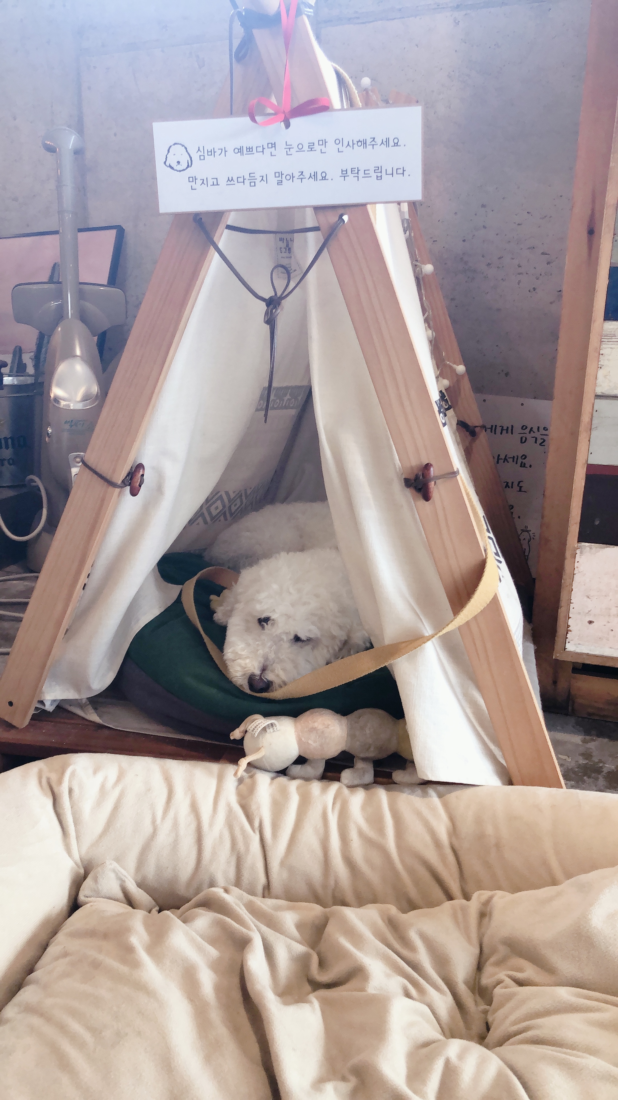 특이하다고 생각했는데 5초도 안 되어 바로 로고의 의미를 알 수 있었다. 카레 가게에 예쁜 강아지 심바가 살고 있기 때문이었다. 평소에 동물을 좋아하는 편인 나는 심바를 불러서 쓰담쓰담 하고 싶었지만 (이건 언제나 마음만이어야 한다. 내 강아지가 아니므로!) 심바는 피곤했는지 집에서 휴식을 취하고 있었다. 만지고 쓰다듬지 말아달라는 안내 문구도 붙어 있었다.