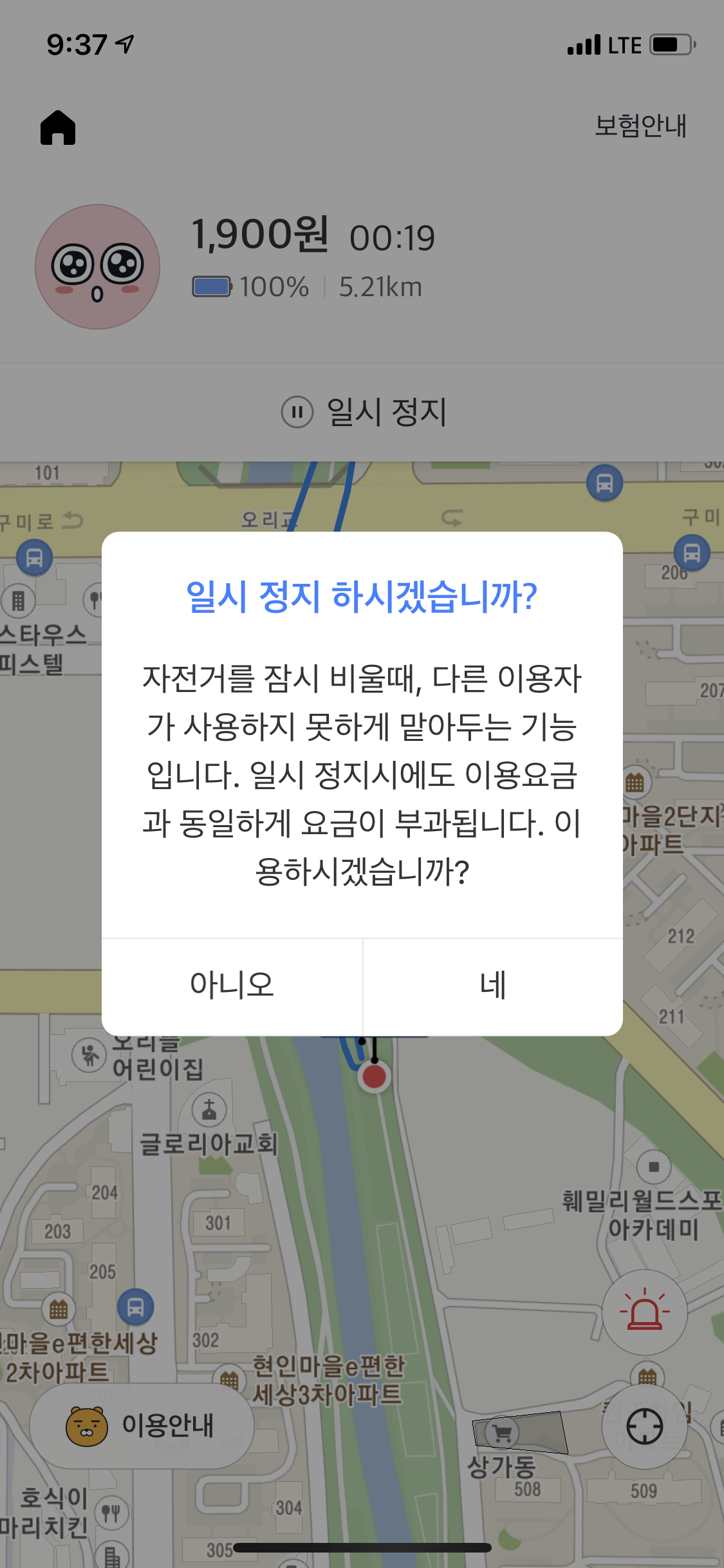 QR코드를 인식하면 자동으로 잠금장치가 풀리며 이용이 시작된다. 타다가 자전거를 잠시 비워야 할 일이 생기면, 다른 이용자가 사용하지 못하도록 맡아두는 일시정지 기능도 있다. 일시정지 시에도 요금은 동일하게 부과되니 참고하도록 하자.
