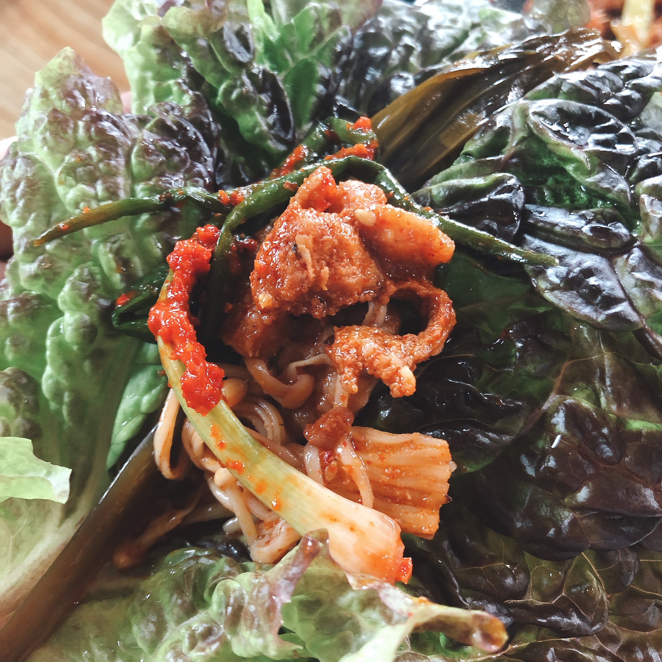 맛있는 더덕오리불고기 완성~ 고기와 버섯, 야채, 된장을 상추위에 올려 쌈으로 먹으면, 과장 좀 보태서 둘이 먹다가 하나가 죽어도 모를 맛이다. 나는 익힌 더덕이 이렇게 달달한지 태어나서 처음 알았다. 입안 가득 베어 물면 고구마 만큼이나 부드럽고 달다.