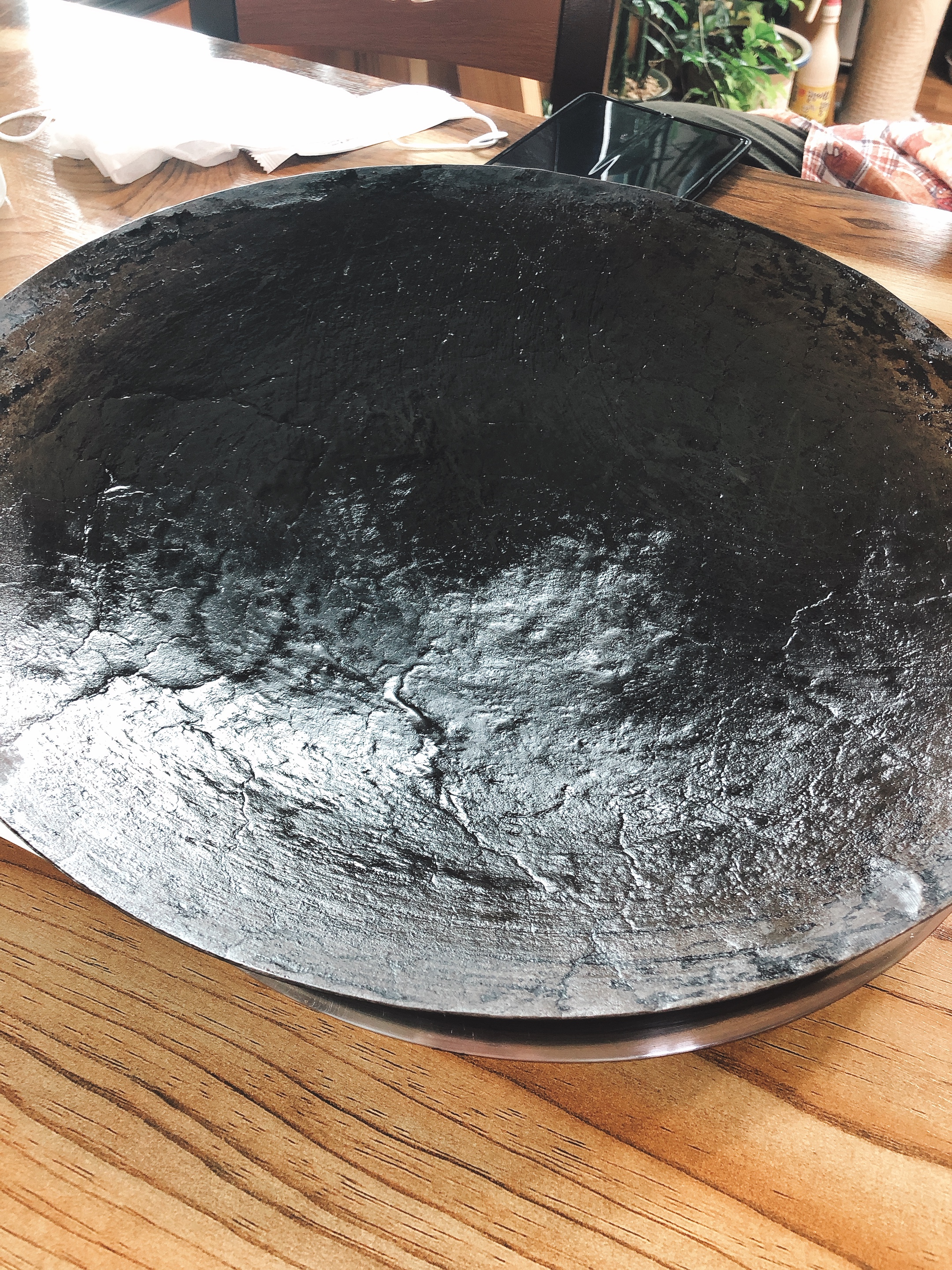 잠시 후 등장한 더덕오리불고기! 가마솥 뚜껑을 뒤집어 놓은 듯한 불판의 모양도 인상적이었다.