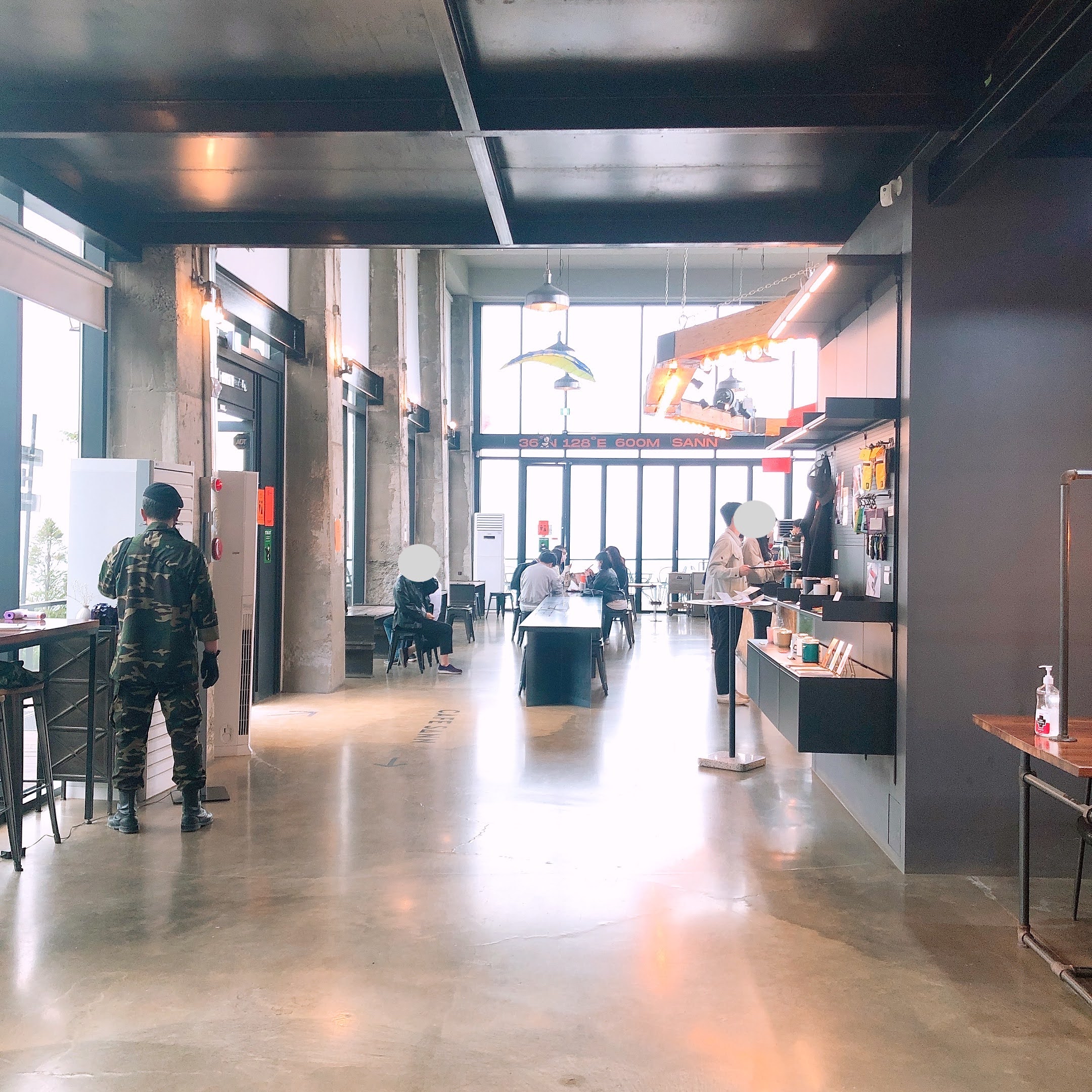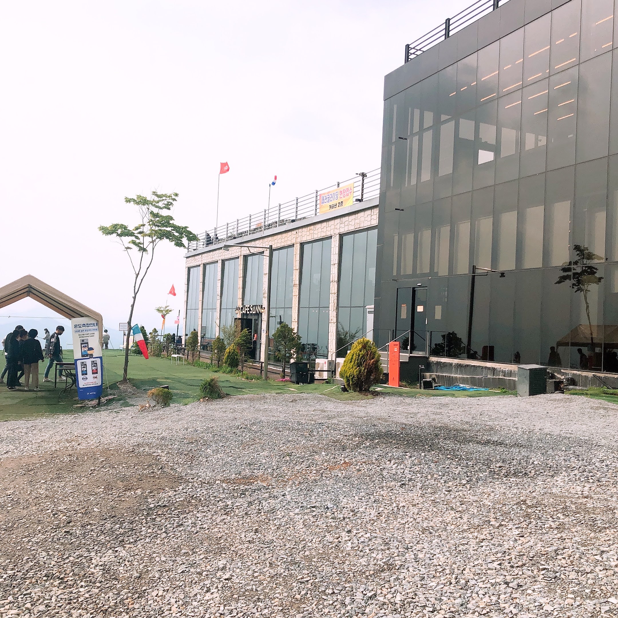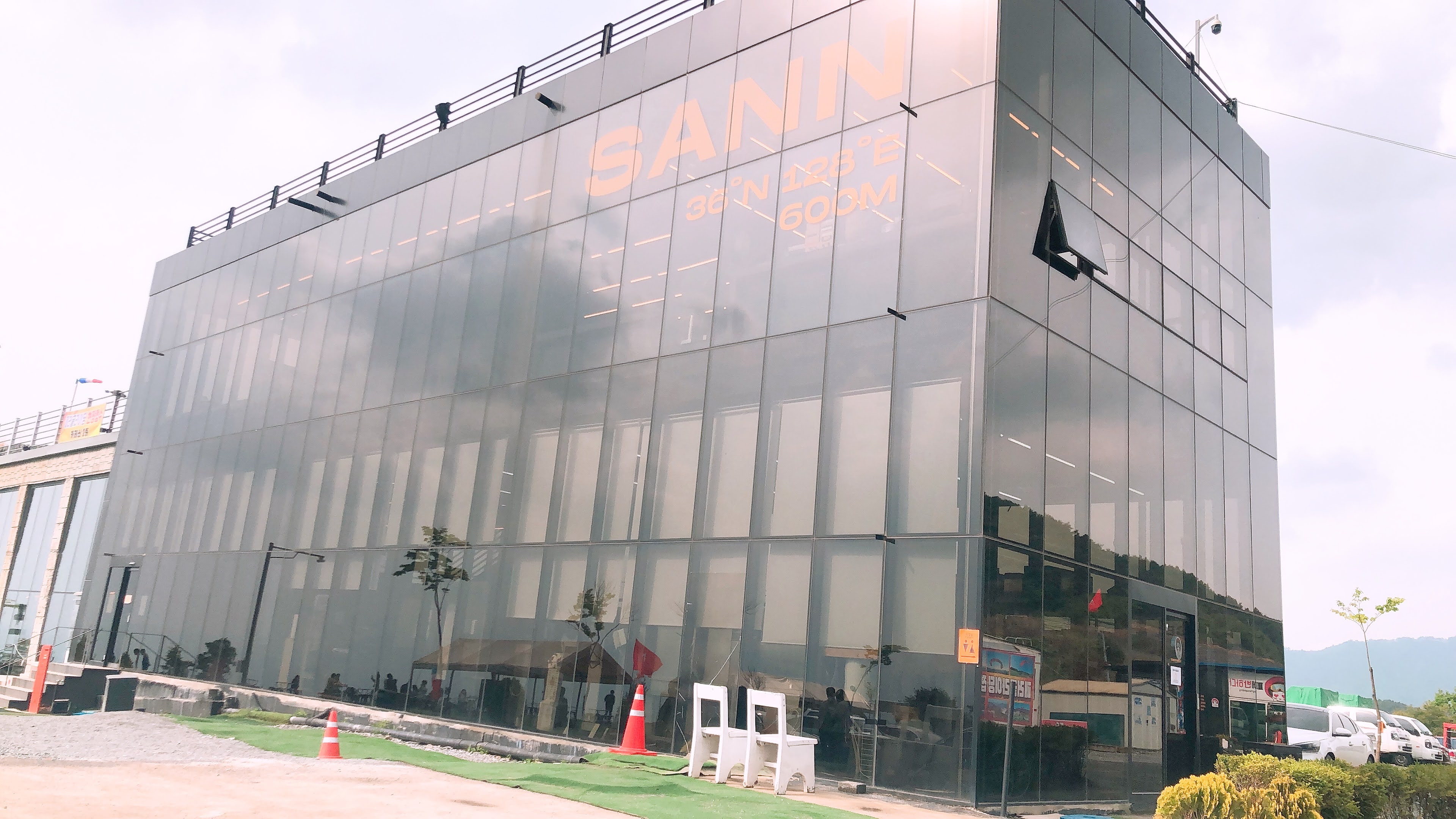구불구불한 산길을 따라 올라가면 유리 창문으로 이루어진 커다란 건물이 나온다. SANN 36ºN 128ºE 600M 라고 쓰여있는 간판(?)이 독창적이고 근사하다고 생각했다.