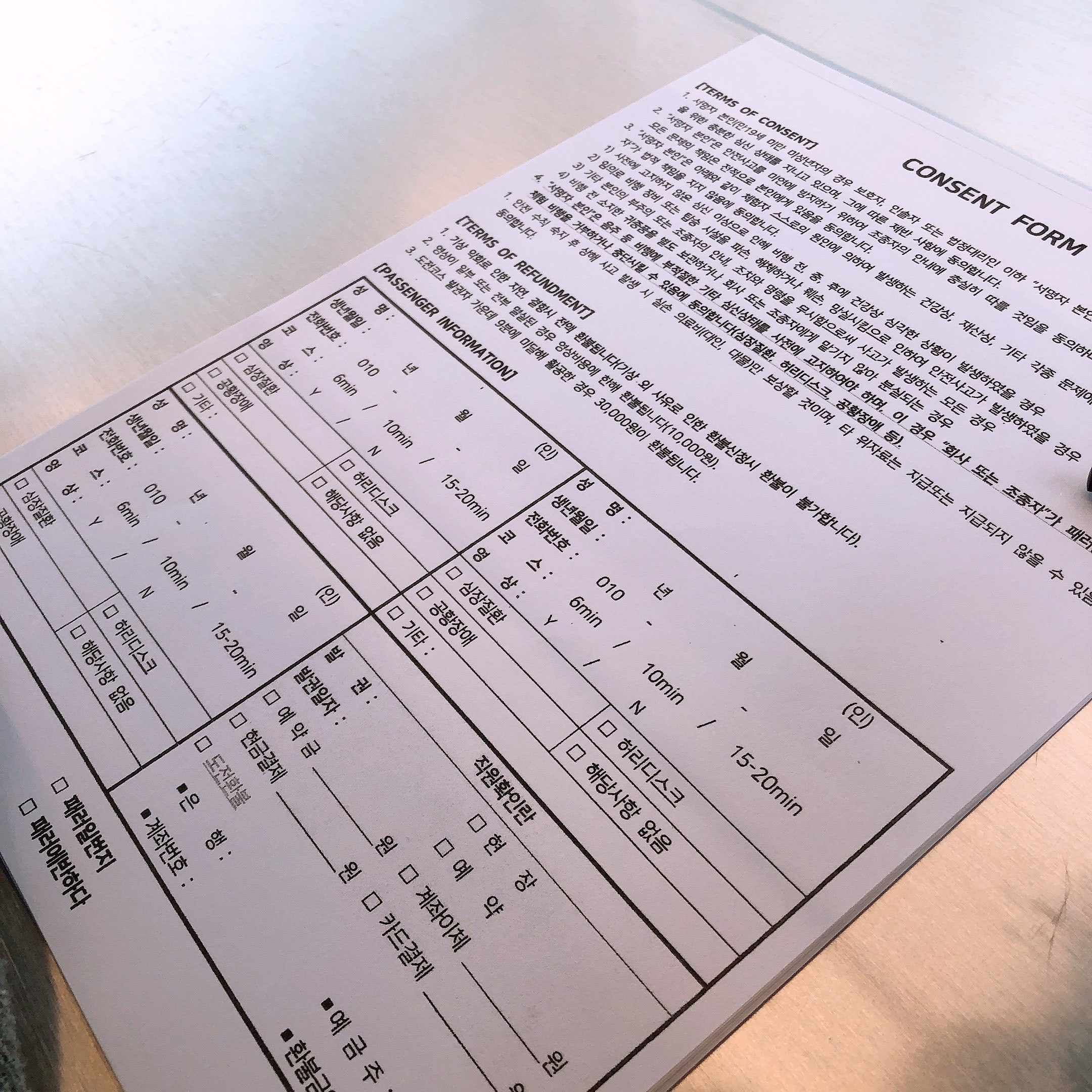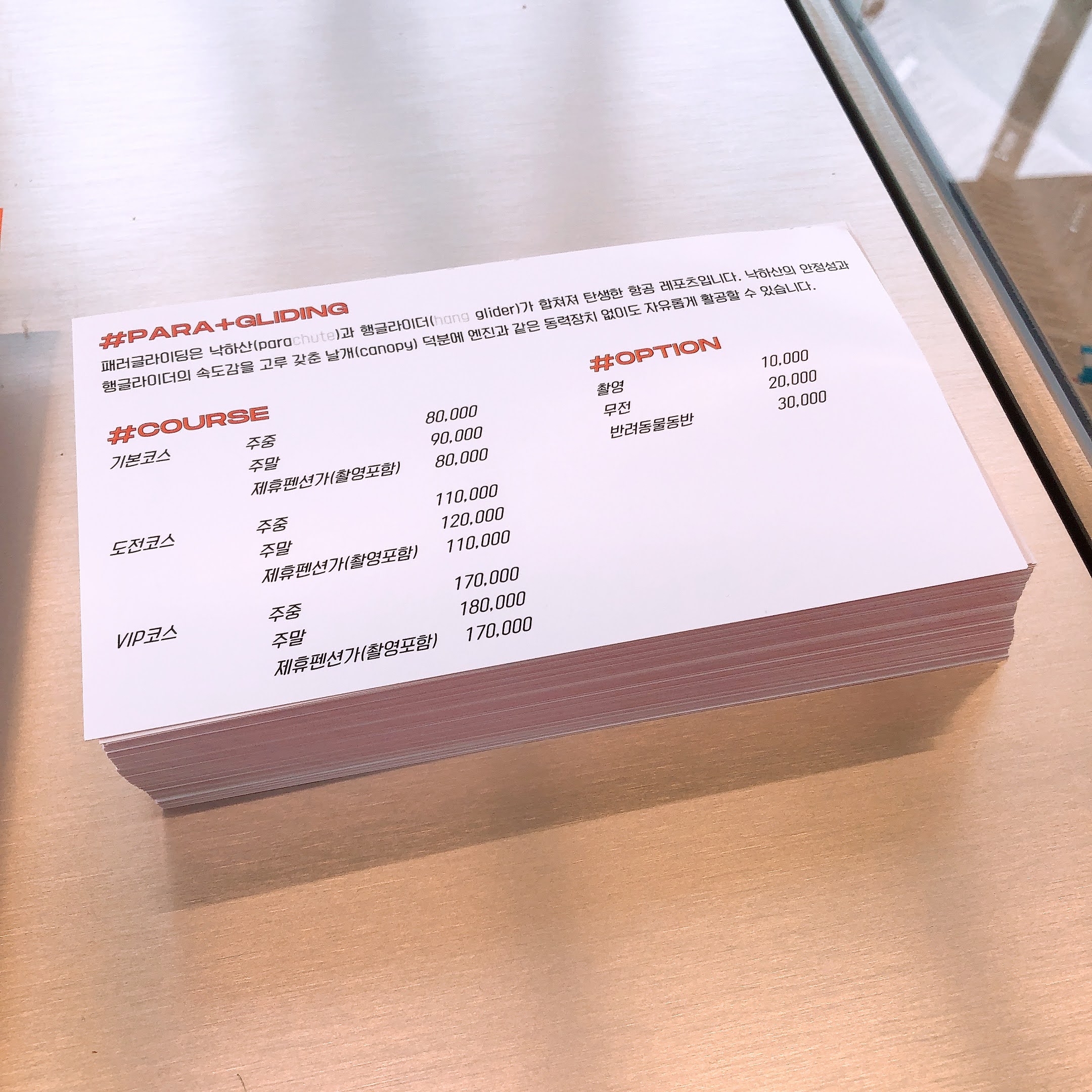 패러글라이딩은 낙하산과 행글라이더가 합쳐져 탄생한 용어라고 한다. 낙하산의 안정성과 행글라이더의 속도감을 고루 갖춘 날개 덕분에 엔진과 같은 동력장치 없이도 자유롭게 활공할 수 있는 항공 레포츠이다. 우리는 코스를 결정하고 인적사항을 작성한 후 대기표를 받을 수 있었다. 인적사항에는 이름, 생년월일, 연락처 외에도 심장질환, 허리디스크, 공황장애 등 건강상의 문제가 없는지 체크하도록 되어 있다.