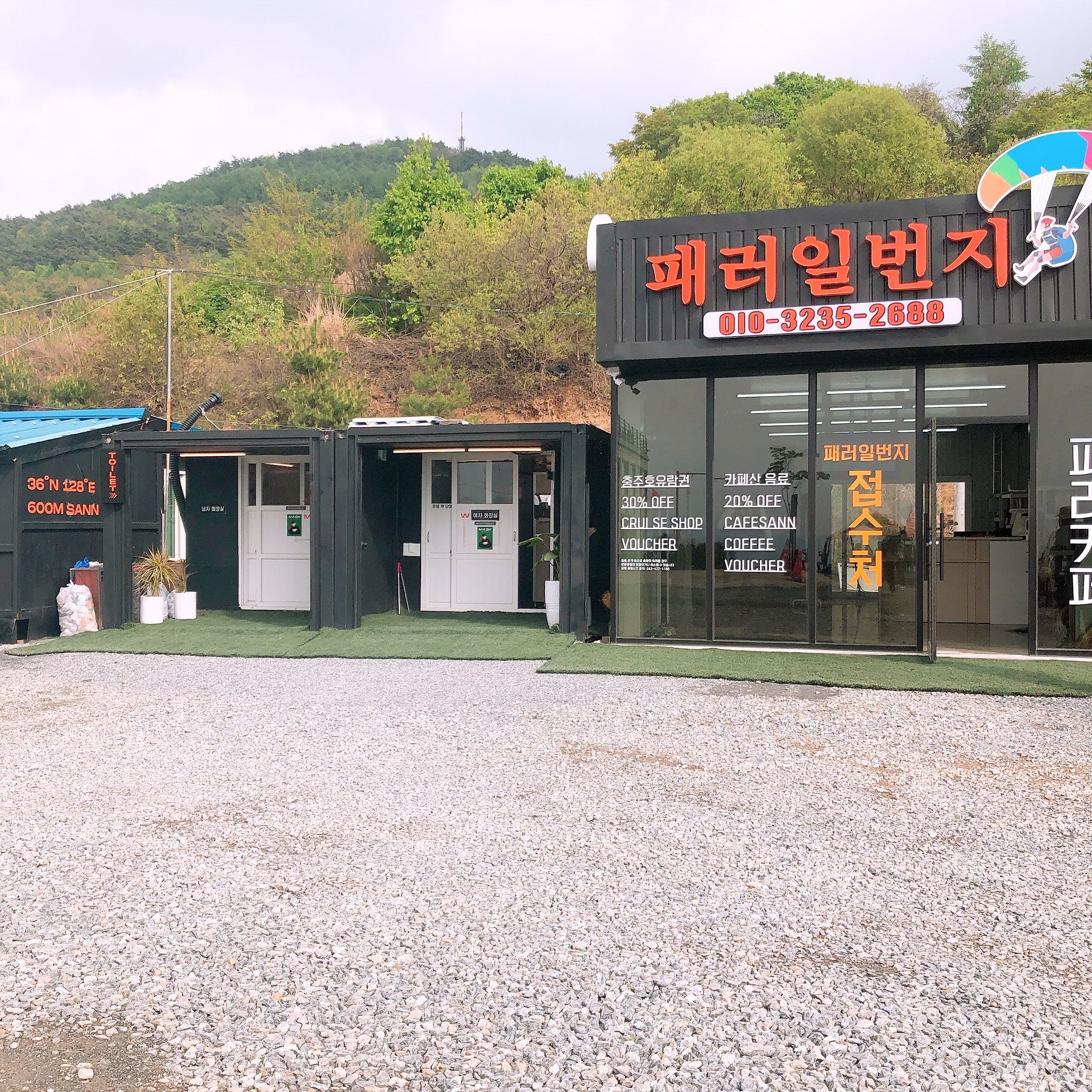 대기표를 받고 1층으로 내려가면 카페산 옆쪽으로 여러개의 패러글라이딩 업체가 있다. 우리는 패러일번지 강사선생님과 매칭이 되어 패러일번지 접수처로 이동해서 안내를 받고 옷을 갈아 입었다.