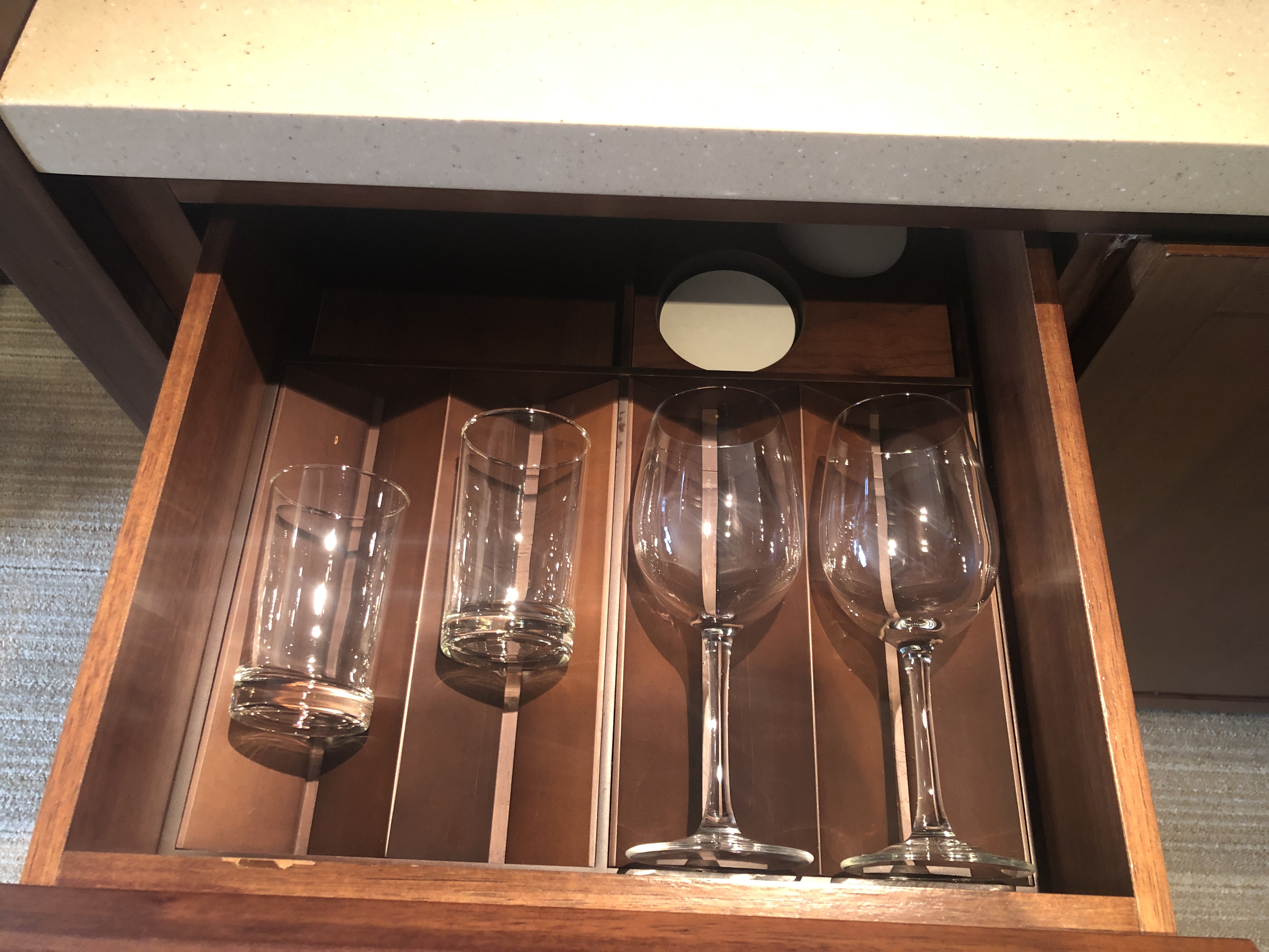 객실 내 취사는 불가하며 500ml 생수 2병과 여러 종류의 티백이 준비되어 있었다. 와인잔과 유리컵, 찻잔도 2개씩 가지런히 놓여 있었다.