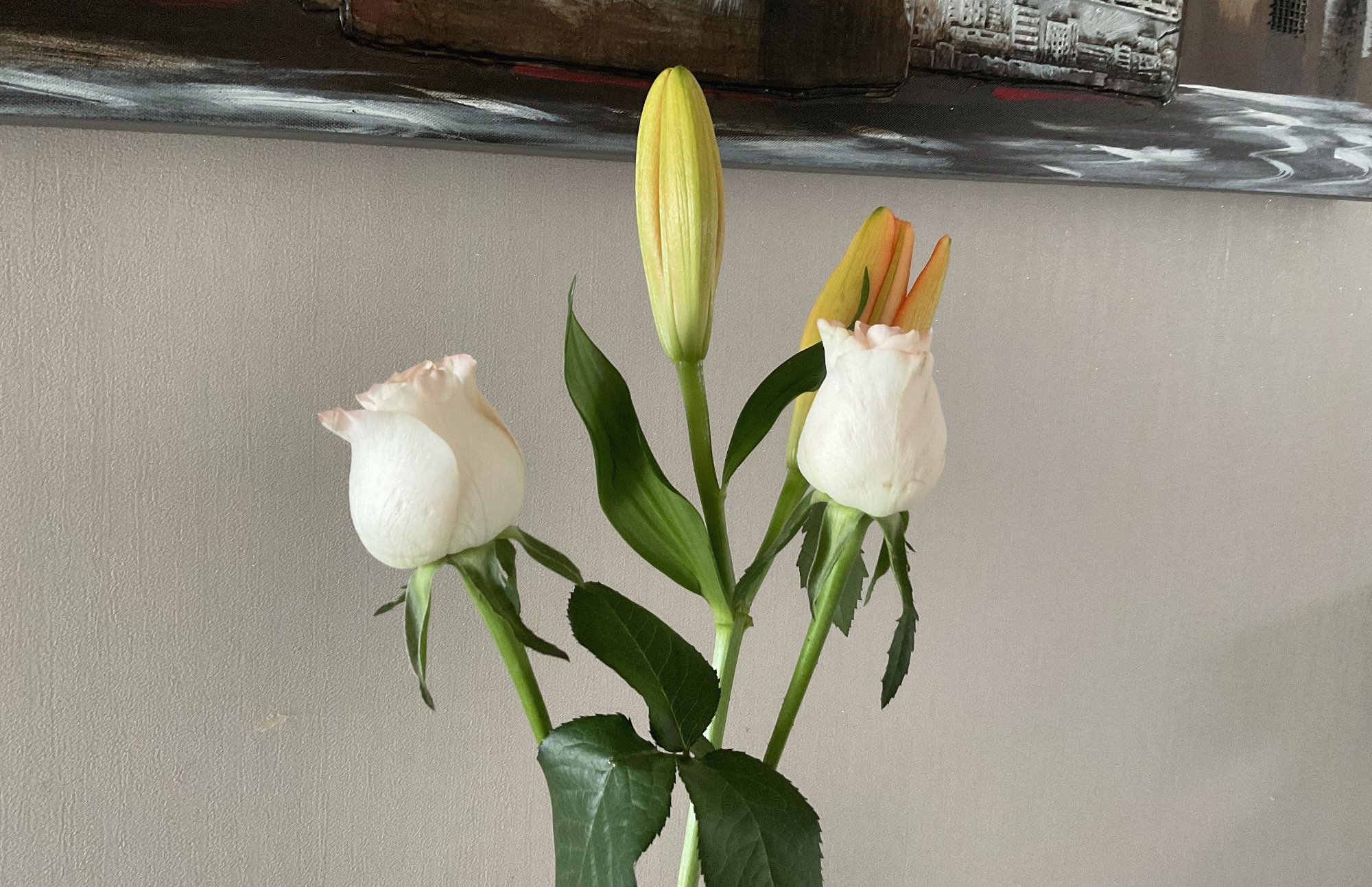가는 길에 꽃을 팔고 있는 부부(로 추정)를 만났다. 포장도 없이 대야에 장미, 수국, 백합 등을 꽂아놓고 2~3줄기씩 묶어 5,000원에 팔고 있었다. 그는 내게 꽃을 사주고 싶다 했고 집에 꽃병이 없어서 망설였는데 파시는 분이 생수통 같은것도 괜찮다고 해서 장미 두송이와 백합 한줄기를 구입했다.
