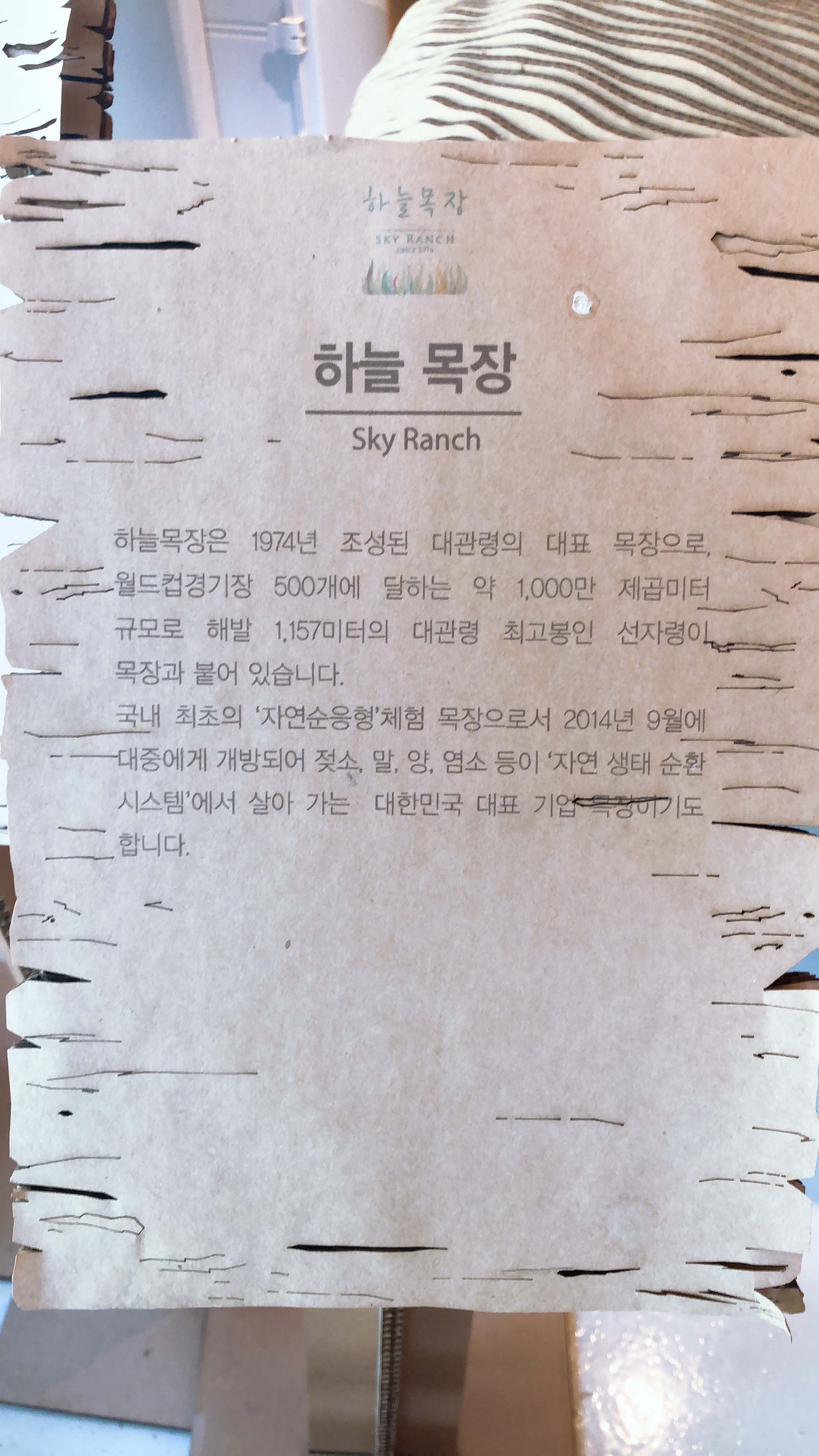 하늘목장 외에도 대관령 양떼목장, 삼양목장 등 여러 후보지를 두고 고민했는데, 리플렛을 비교해본 결과 하늘목장의 컨텐츠가 가장 다양해 보였다. 아마도 모든 목장들이 제공하는 컨텐츠가 겹치는 것이 많을 것이므로, 여러 군데를 모두 방문할 필요는 없을 듯 해서 둘째날 일정을 대관령 하늘목장 -> 오대산 월정사(+전나무 숲길)로 정했다.