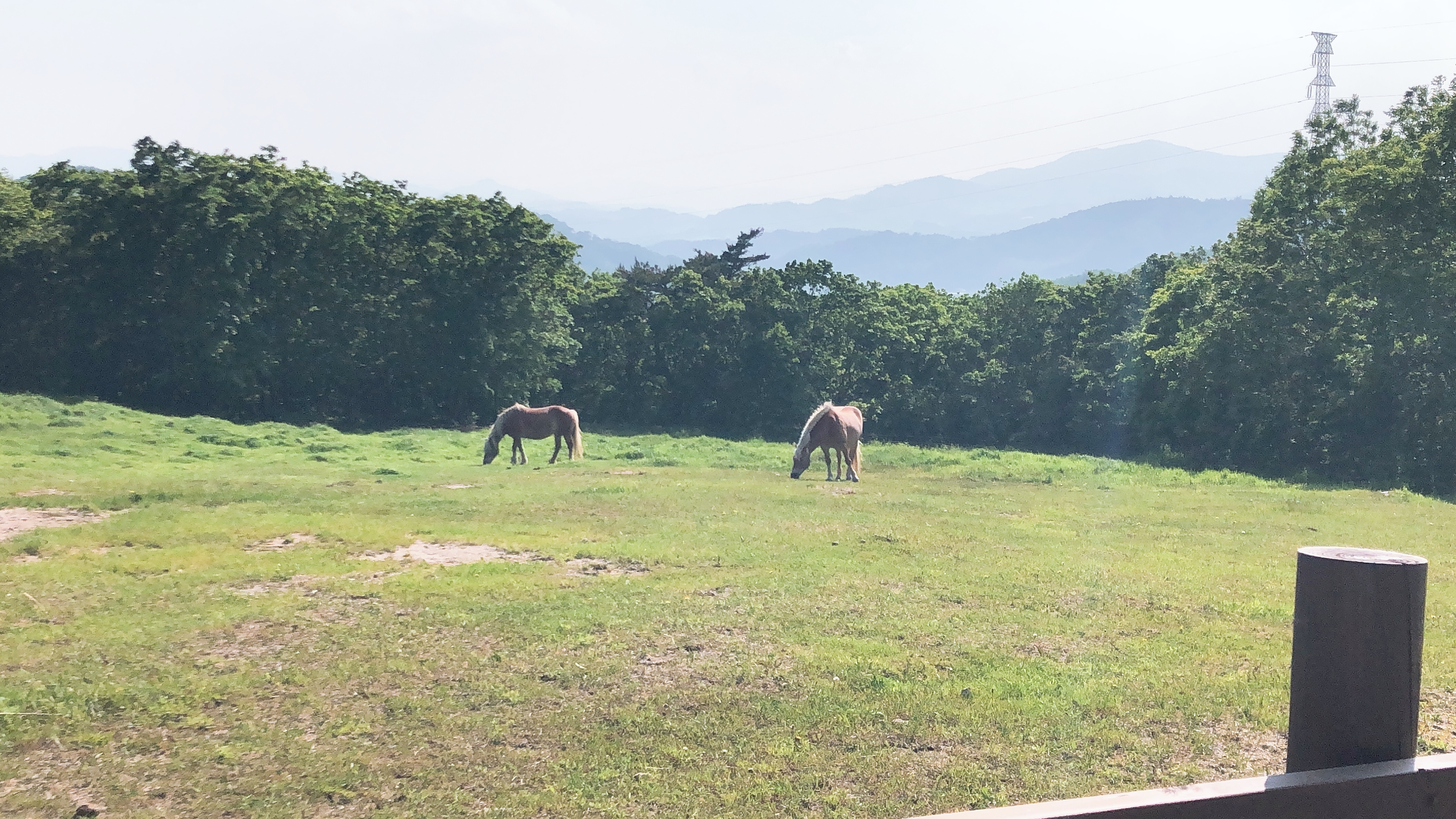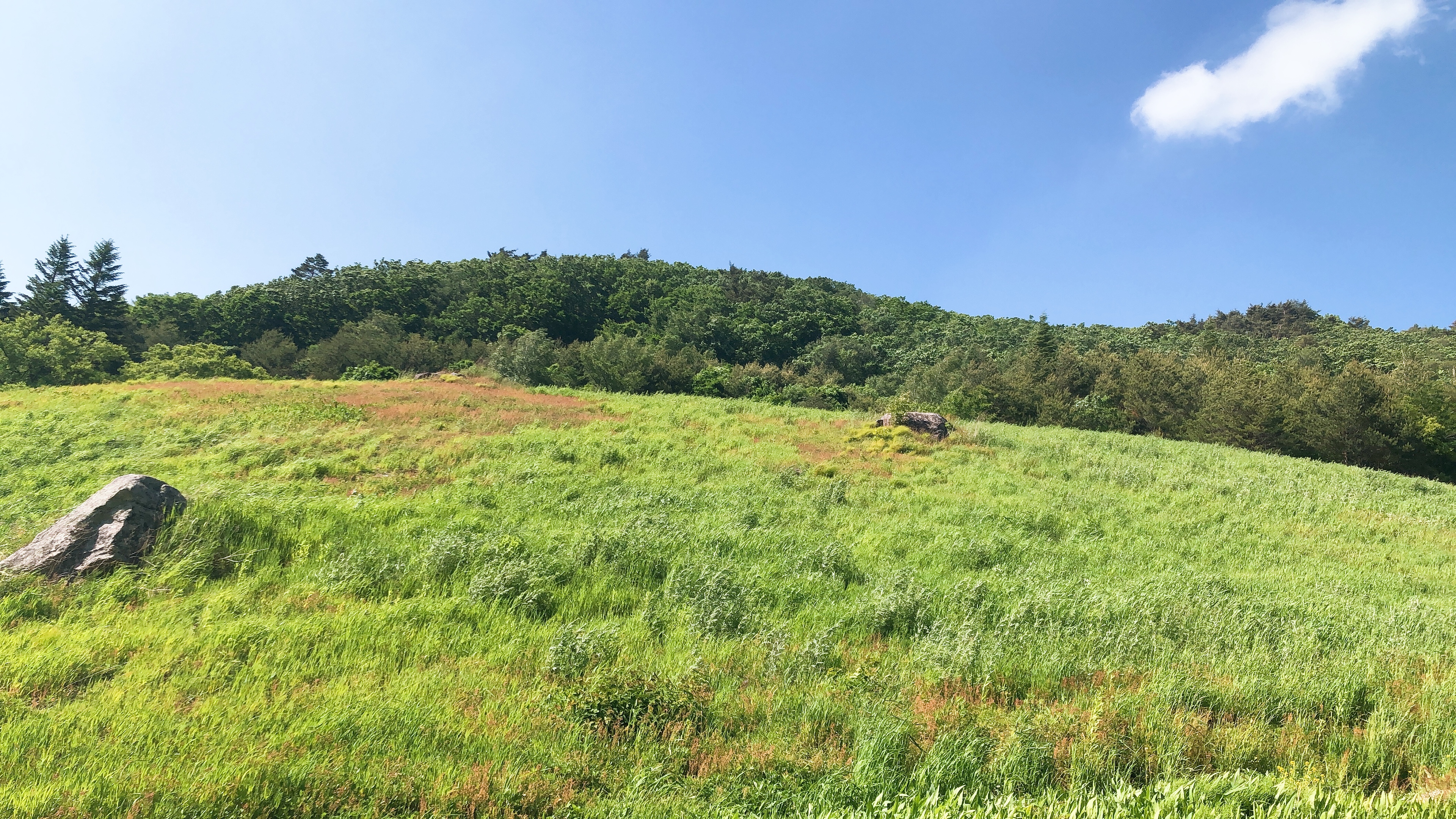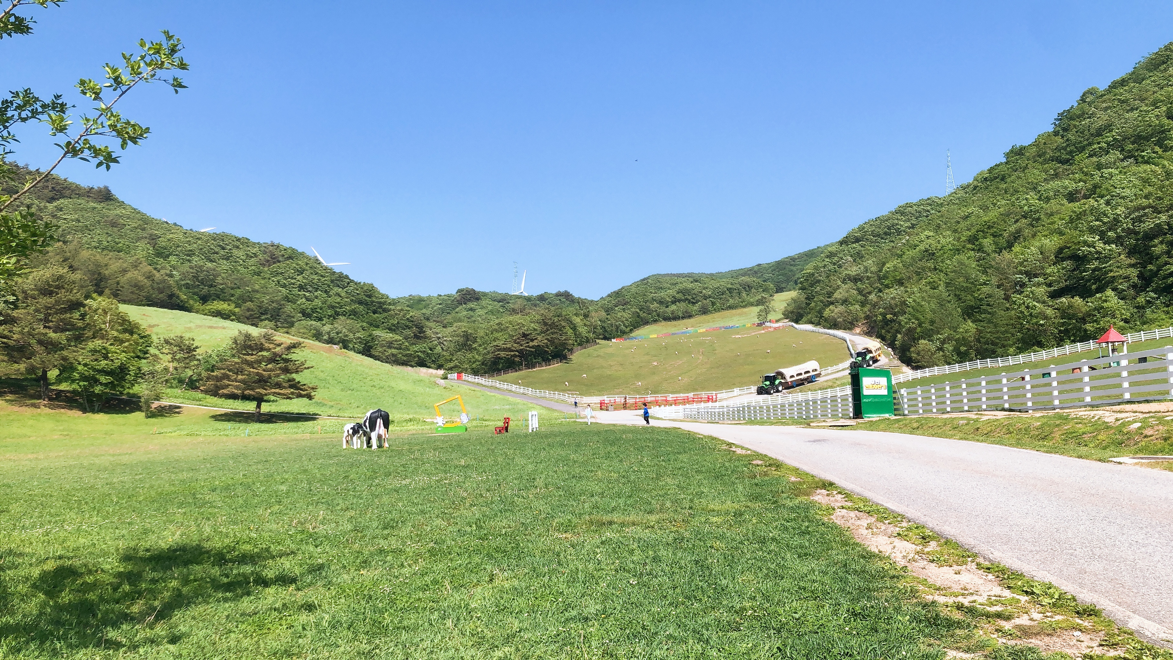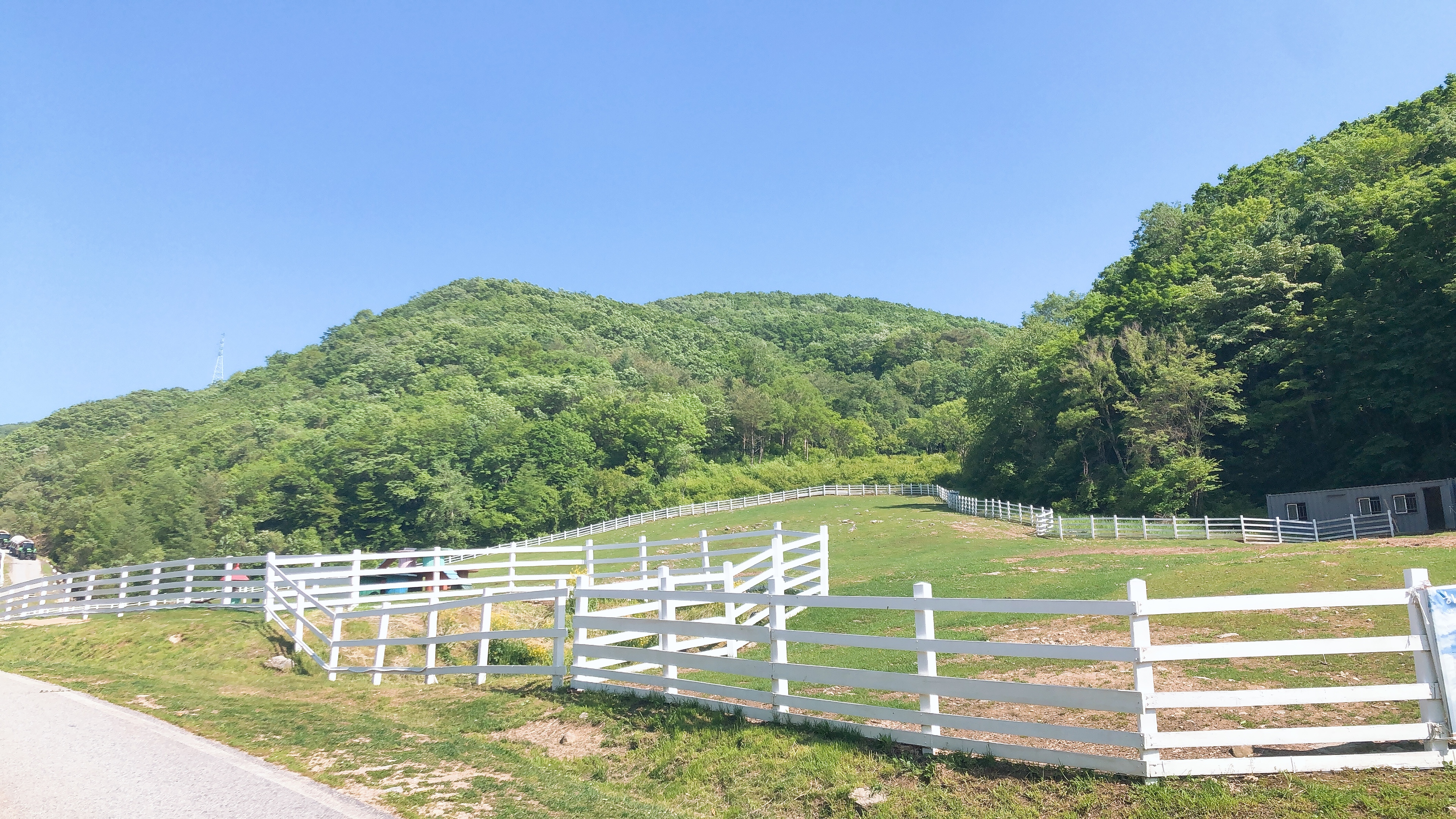 먹이주기 체험을 마치고 목장을 한바퀴 돌아보기로 한 우리는 트랙터마차가 다니는 길을 따라 위로 올라갔다. 산책로를 따라 울타리가 쳐져있고 양, 젖소, 말 등을 볼 수 있다. 가축의 방목을 위한 적정 초지는 1마리당 25,000제곱미터가 필요하다고 한다. 하늘목장에서는 가축들의 건강한 방목을 위해 주기적으로 방목지를 옮긴다고 한다. 그래서인지 가축이 없는 방목지도 꽤 많았다.