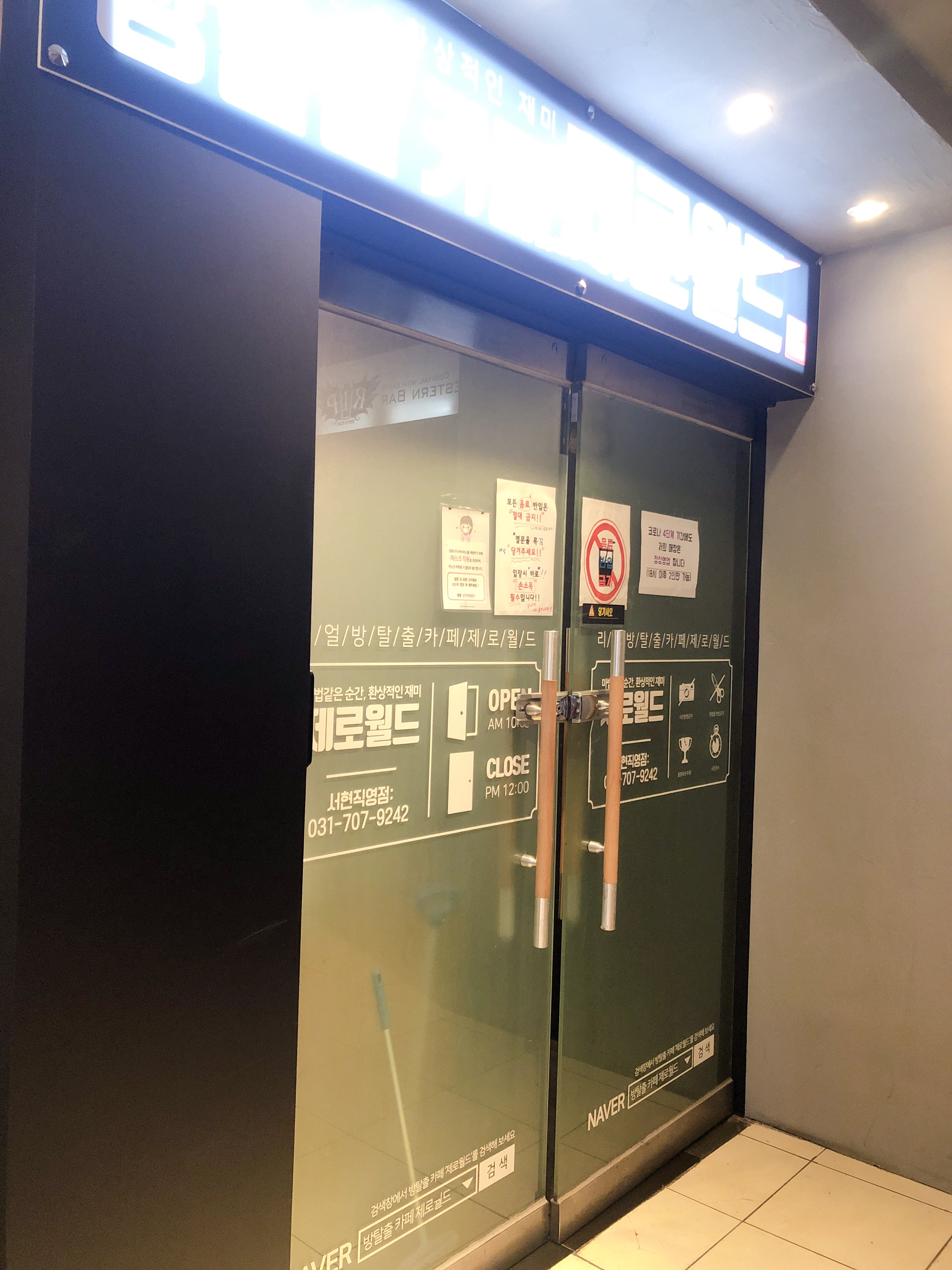제로월드 서현점은 서현역 AK 프라자 근처에 위치해 있다. 건물에 기계식 주차가 가능하며, 방탈출 카페는 지하 1층에 있다. 주차장에 주차를 하고 올라가려니 창문 너무 보이는 엘리베이터... 하지만 엘리베이터를 타기 위해 지나가야 하는 입구가 자물쇠로 잠겨 있었다-_-; 뭐지? 주차장부터 탈출인가? 비상구 계단를 찾아 여차저차 올라갔다.