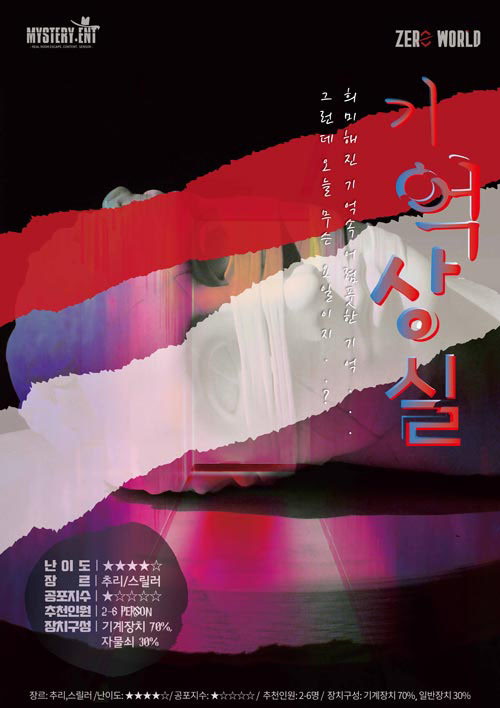 지난 번 만족스럽게 플레이했던 서현 방탈출카페 제로월드 다른 테마에 도전해보기로 했다. 당일 예약이어서 선택권이 많지는 않았고, 우리가 방문 가능했던 시간대의 '기억상실' 이라는 테마를 예약했다. 기억상실은 추리/스릴러 장르로 제로월드 테마 중에서는 난이도가 있는 편이다.