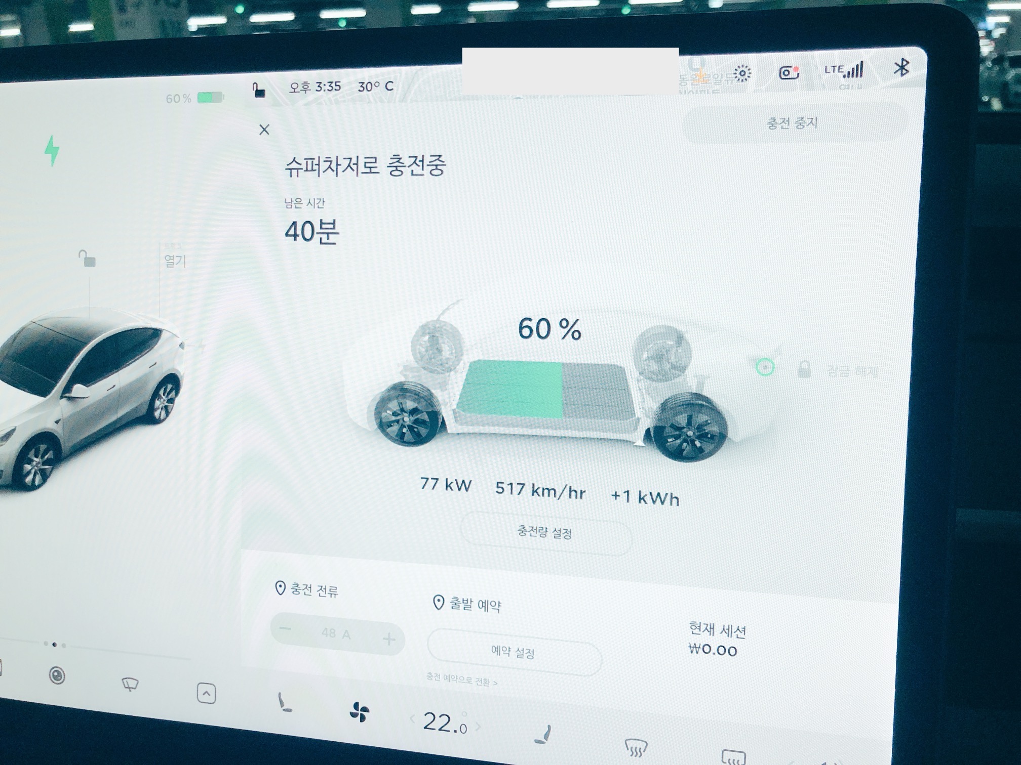 충전을 멈추고 싶다면 테슬라 액정 오른쪽 위에 있는 충전 중지 버튼과 차량 사진 뒤쪽에 있는 잠금 해제 버튼을 차례대로 누르고, 꽂혀있는 충전기를 빼주면 된다. 배터리 잔량이 60%였는데 남은 시간이 40분 정도로 표시되어 다른 곳보다 빠른 충전이 가능한 것을 확인할 수 있었다.