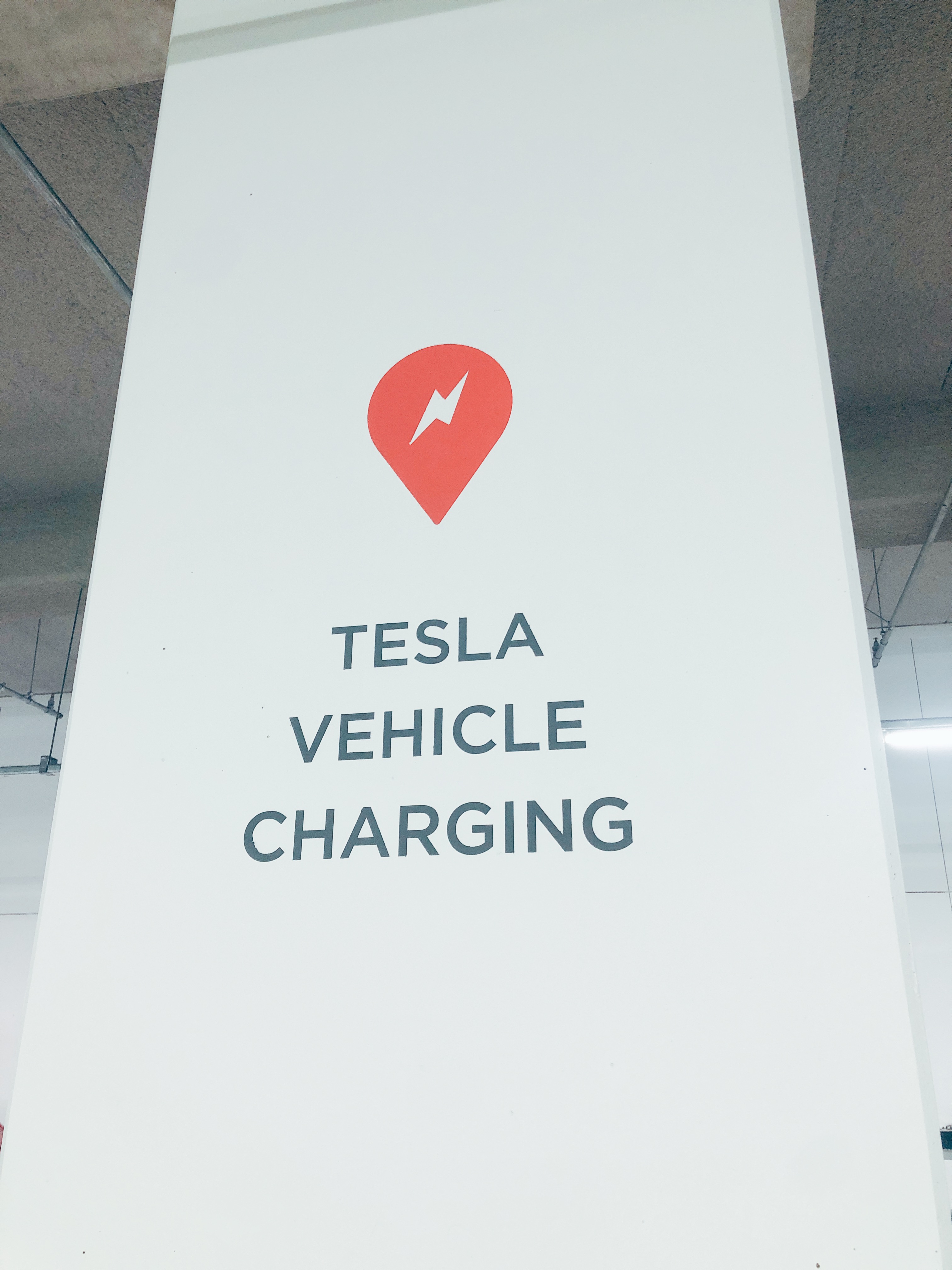 기둥에 TESLA VEHICLE CHARGING 이라고 적혀 있었다. 최대 250kW까지 충전 가능한 수퍼 차저가 6개 설치되어 있고 24시간 이용이 가능하다고 한다. 바로 옆에는 완속충전기 6개도 있어서 상황에 맞게 선택해서 이용할 수 있다. 밥 먹고 쇼핑하고 하려면 시간이 꽤 걸리기 때문에, 주차해두고 쇼핑을 다녀올 예정이라면 수퍼 차저 보다는 완속충전기를 이용하는 것이 편리하지 않을까 싶다. 물론 슈퍼차저 충전속도가 매우 빨라서 차에 잠시 머물러도 부담이 크지 않다.